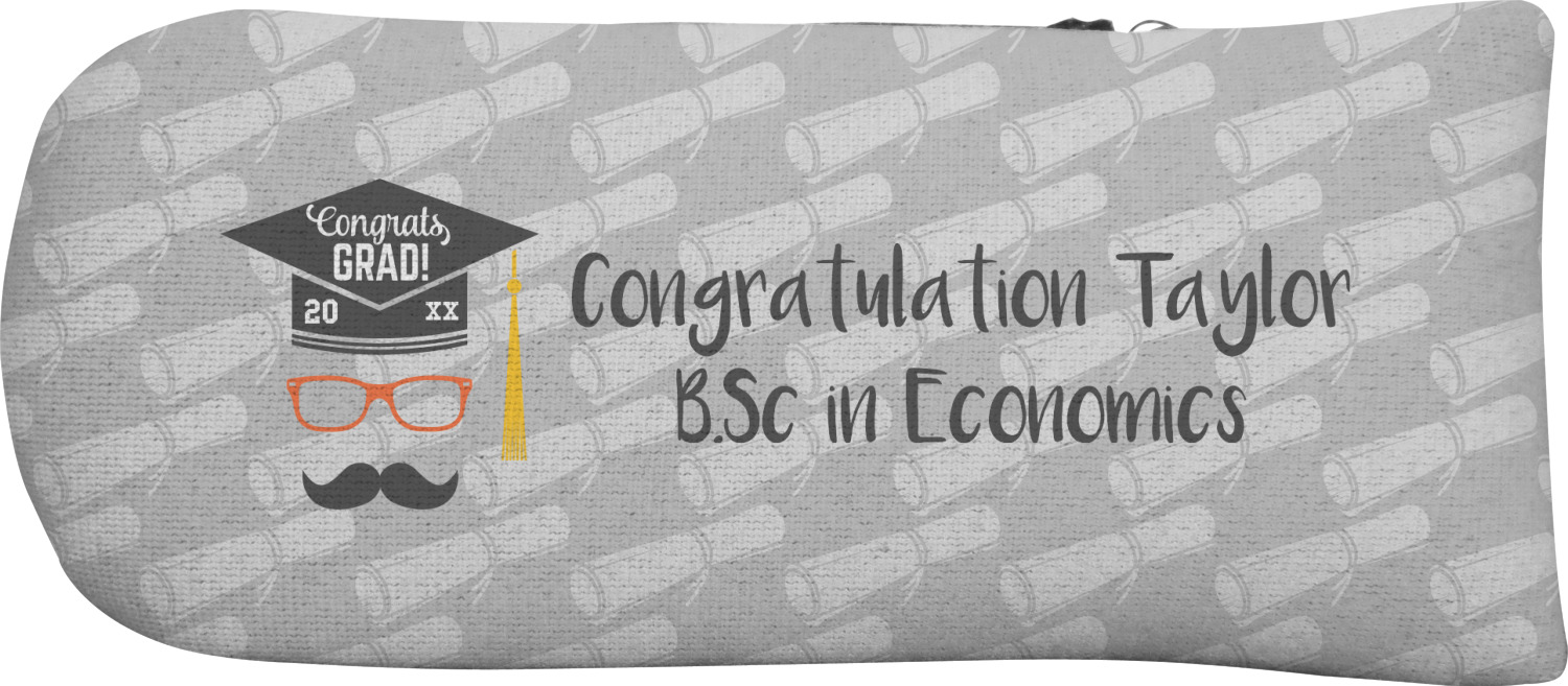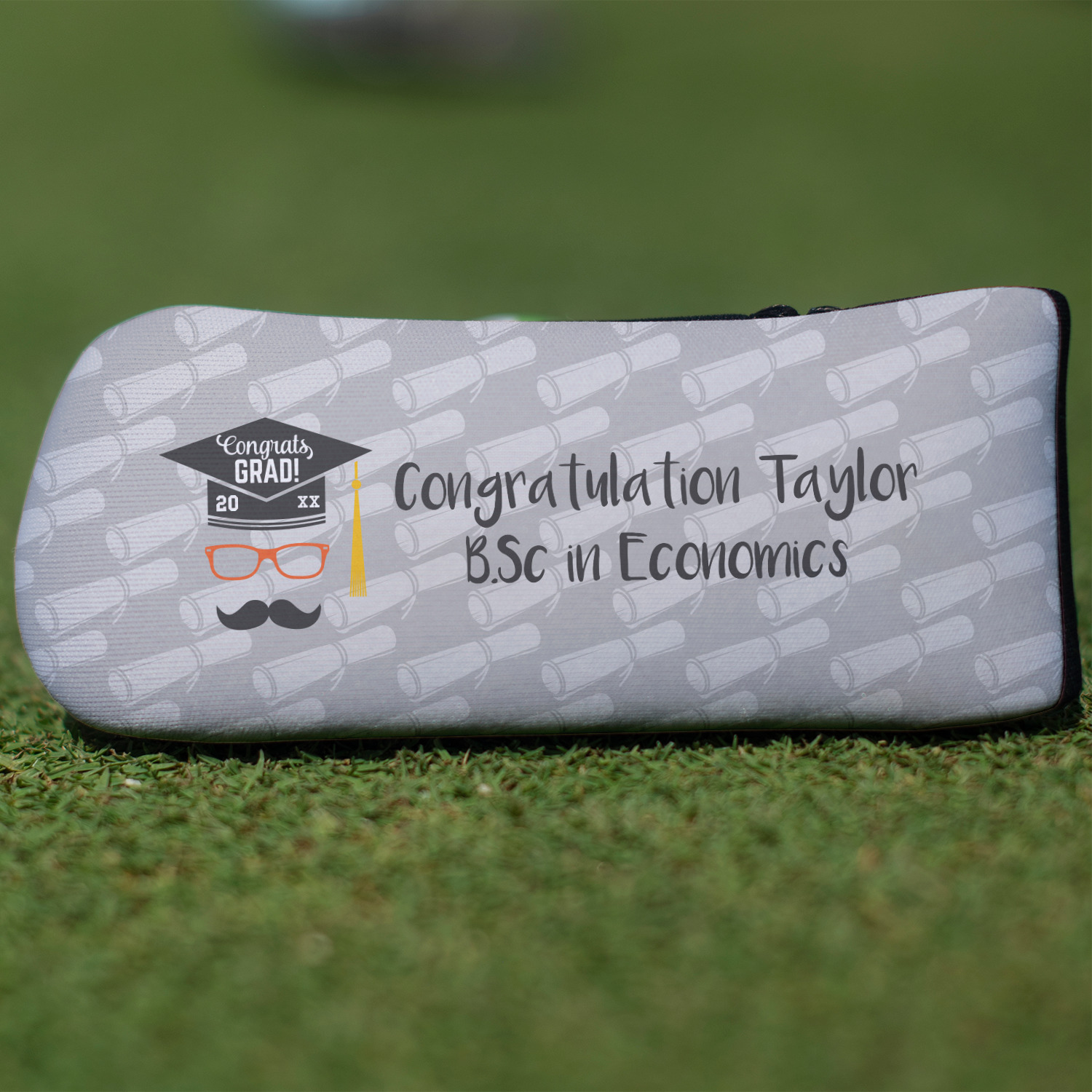 This whimsical and fun design makes the perfect graduation gift. We chose a tone on tone background with graduation scrolls and chose a light grey color. We chose graphic with circular text for our personalization style; change the text to suit your graduate. Customize the colors in the hipster graphic including the glasses, tassel and mustache color. We have other graduate backgrounds as well as graduate graphic in our system. So go ahead and change things to suit your graduate.