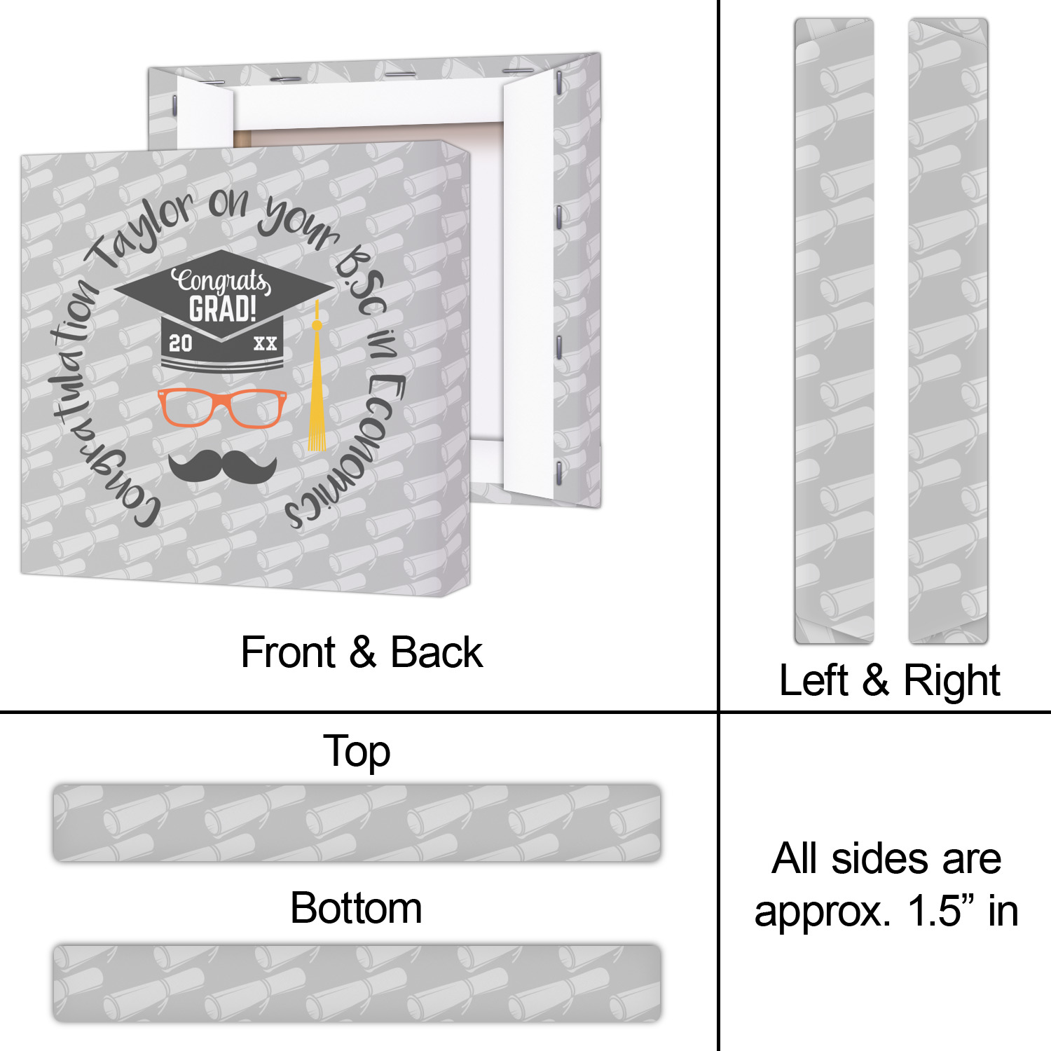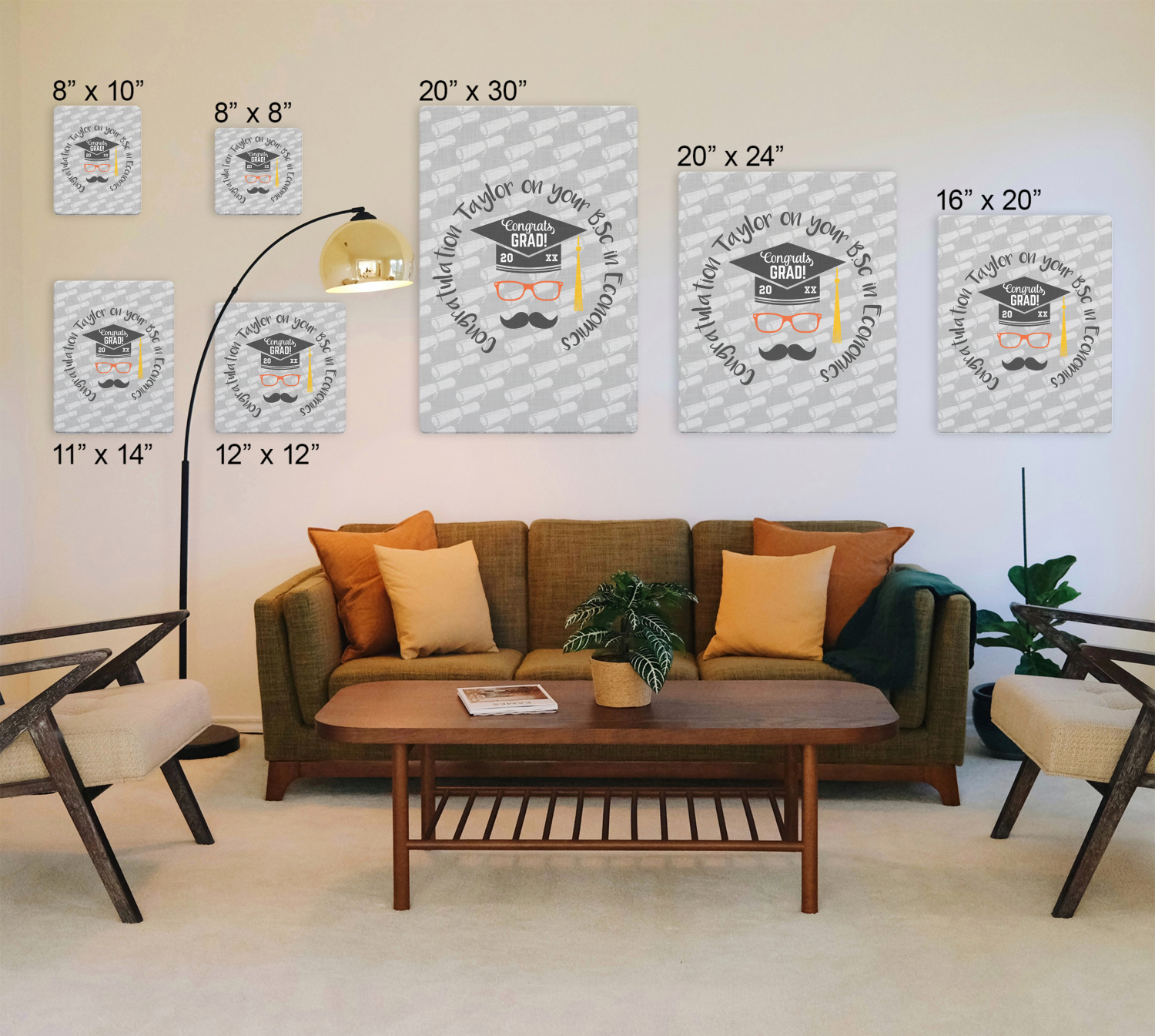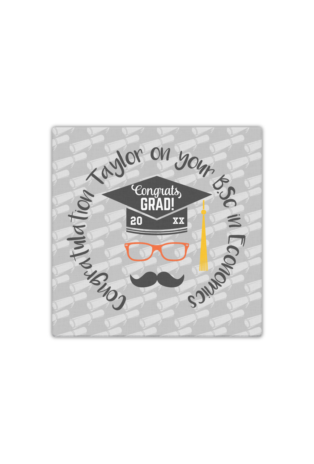 This whimsical and fun design makes the perfect graduation gift. We chose a tone on tone background with graduation scrolls and chose a light grey color. We chose graphic with circular text for our personalization style; change the text to suit your graduate. Customize the colors in the hipster graphic including the glasses, tassel and mustache color. We have other graduate backgrounds as well as graduate graphic in our system. So go ahead and change things to suit your graduate.