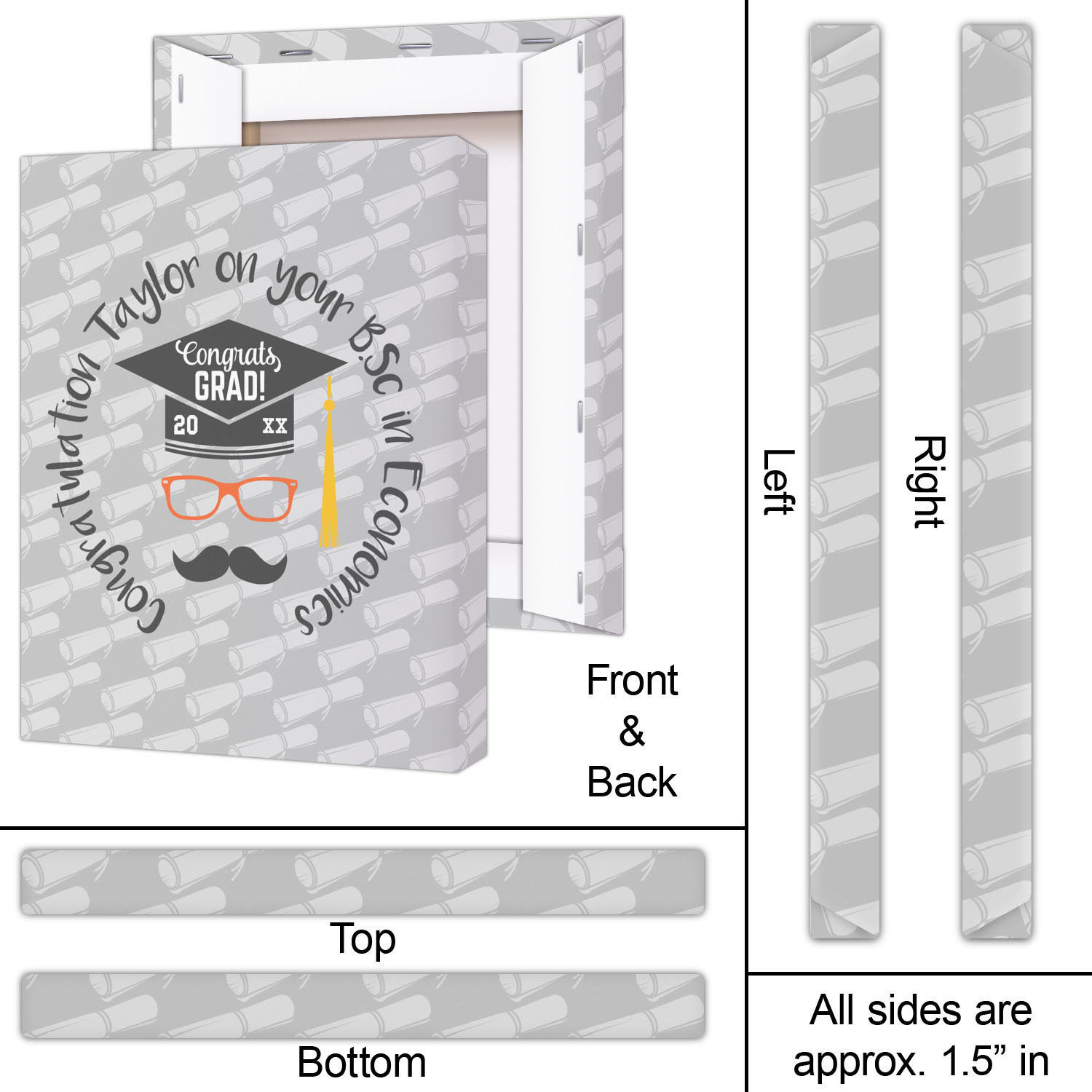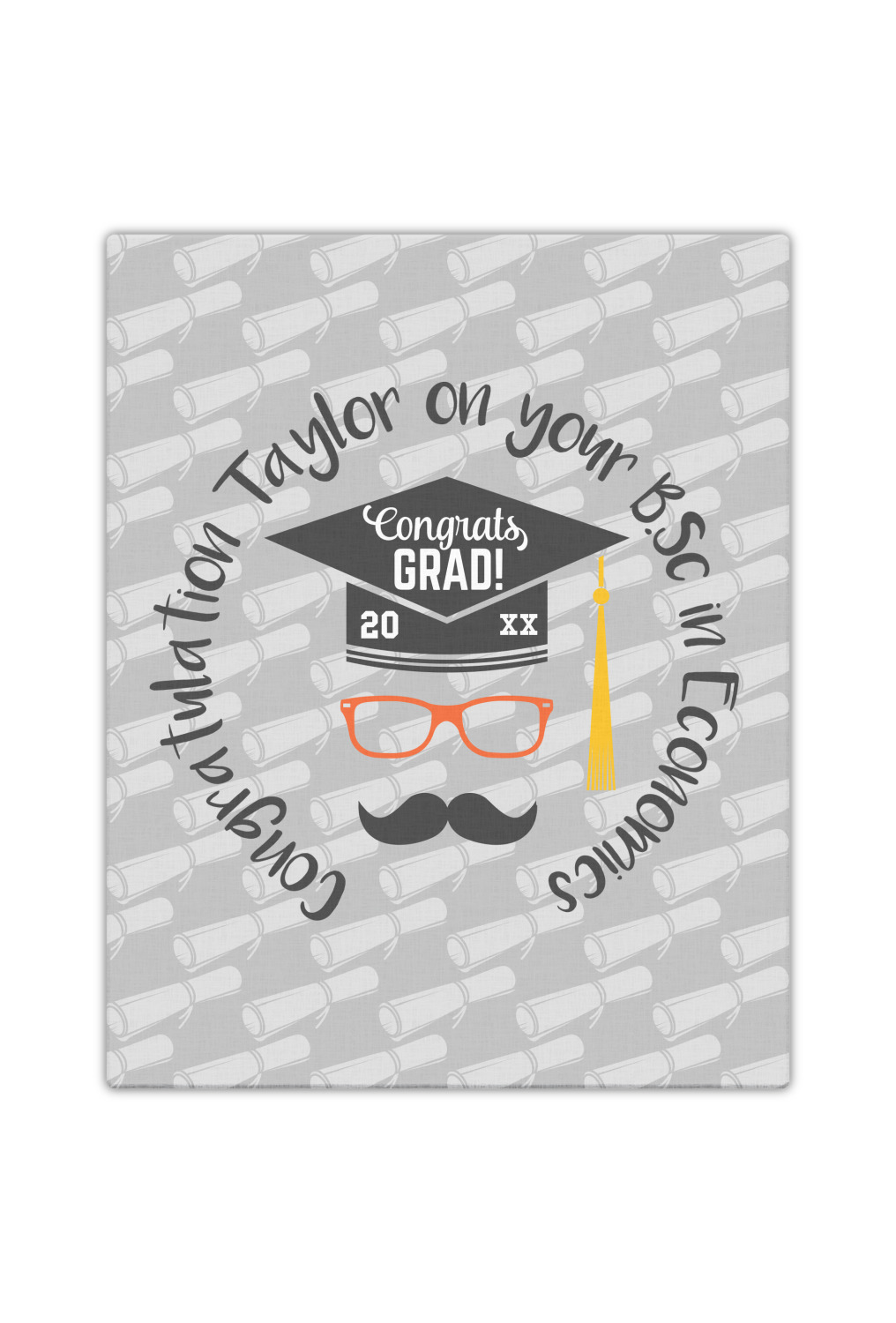 This whimsical and fun design makes the perfect graduation gift. We chose a tone on tone background with graduation scrolls and chose a light grey color. We chose graphic with circular text for our personalization style; change the text to suit your graduate. Customize the colors in the hipster graphic including the glasses, tassel and mustache color. We have other graduate backgrounds as well as graduate graphic in our system. So go ahead and change things to suit your graduate.