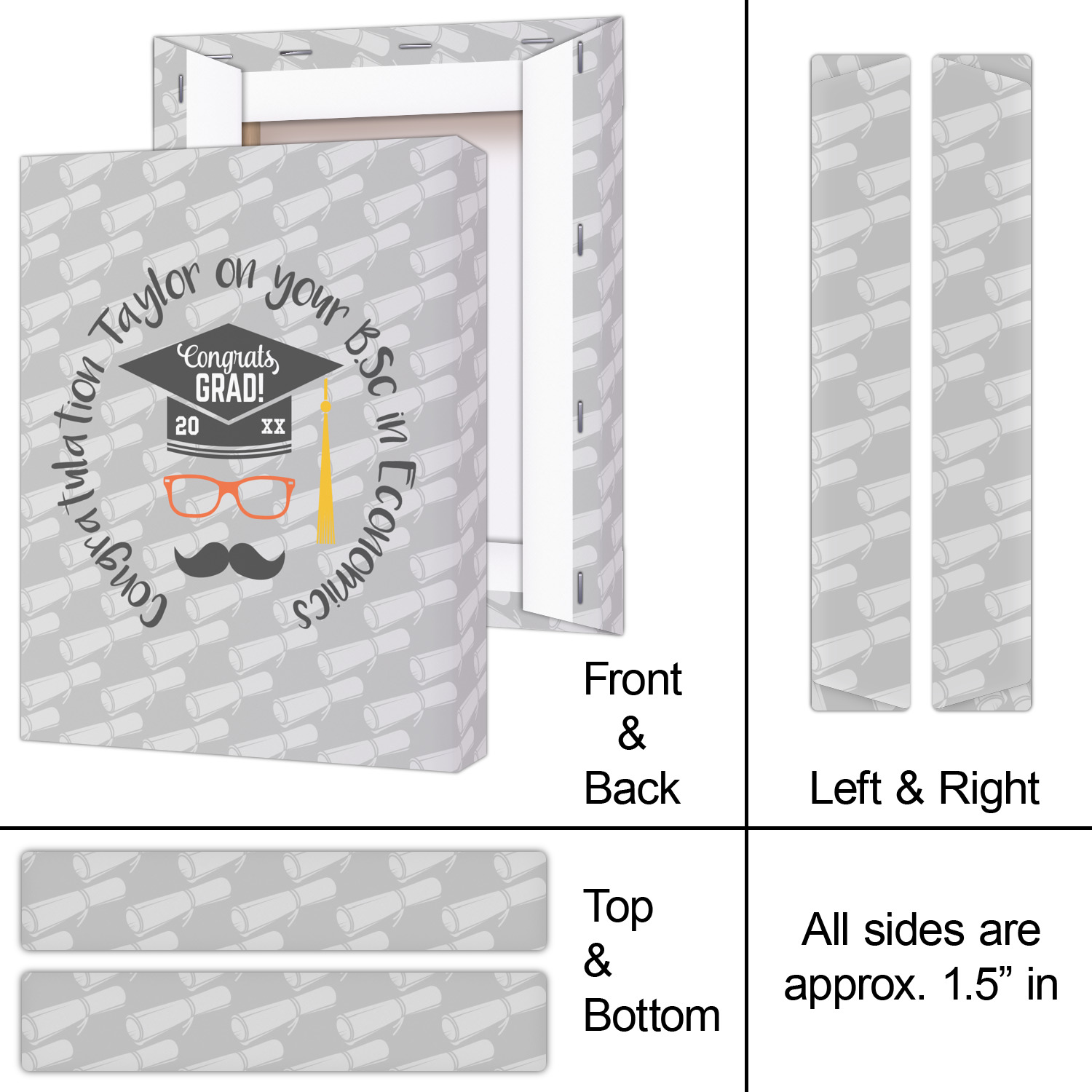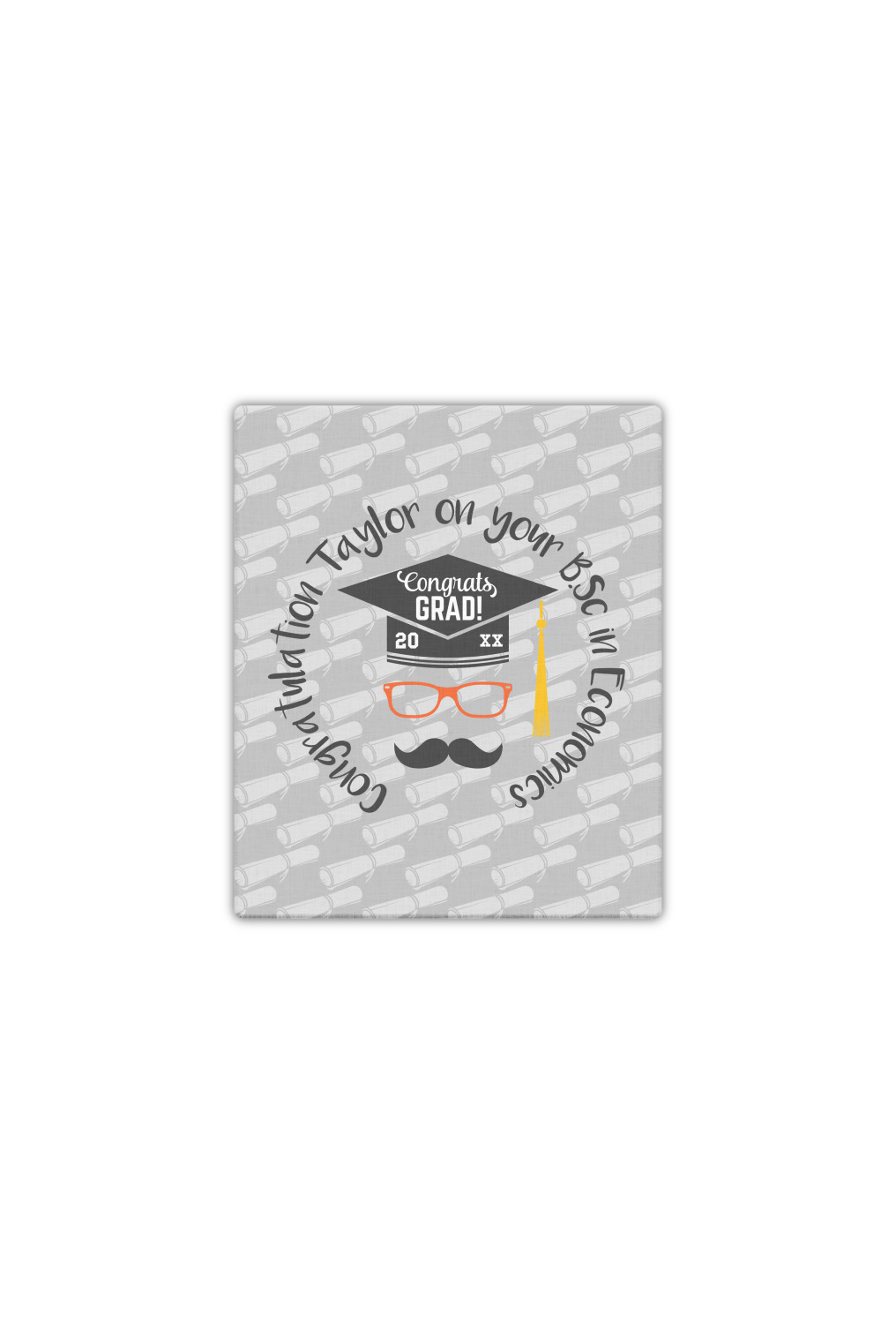 This whimsical and fun design makes the perfect graduation gift. We chose a tone on tone background with graduation scrolls and chose a light grey color. We chose graphic with circular text for our personalization style; change the text to suit your graduate. Customize the colors in the hipster graphic including the glasses, tassel and mustache color. We have other graduate backgrounds as well as graduate graphic in our system. So go ahead and change things to suit your graduate.