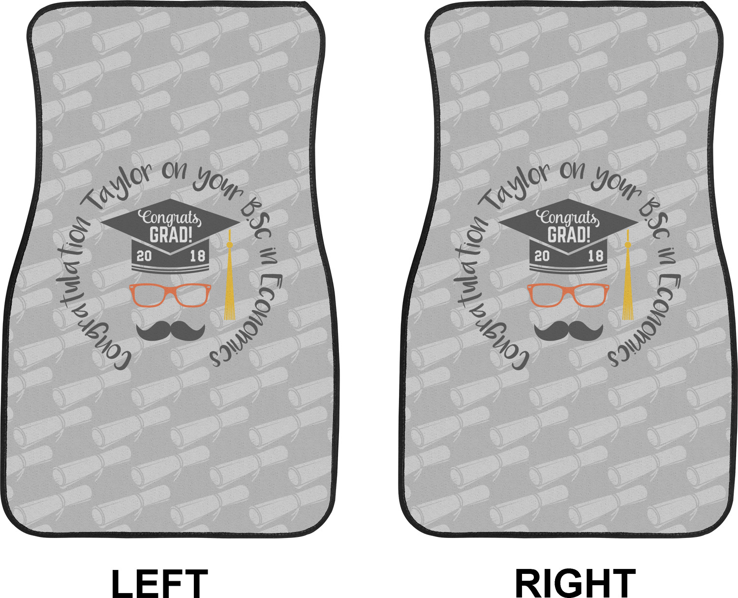 We craft our auto floor mats mats from polyester, apply a black finish to the edges, and lined at the bottom to prevent slippage. These mats protect your floors from grass, mud, and any accidental spills. We display your personalized design on the front face of each mat. The sizes of these car floor liners are standardized to provide a versatile fit for all vehicles. The front rows car mats measure at 17 by 26.5 inches, while the back rows measure at 17 by 13 inches. We sell three packages of car floor mats. You can purchase a pair of front row car mats, a pair of back row car mats, or a set of front row and back row car mats. To make an informed purchase, we recommend measuring the surface area of your car floors.