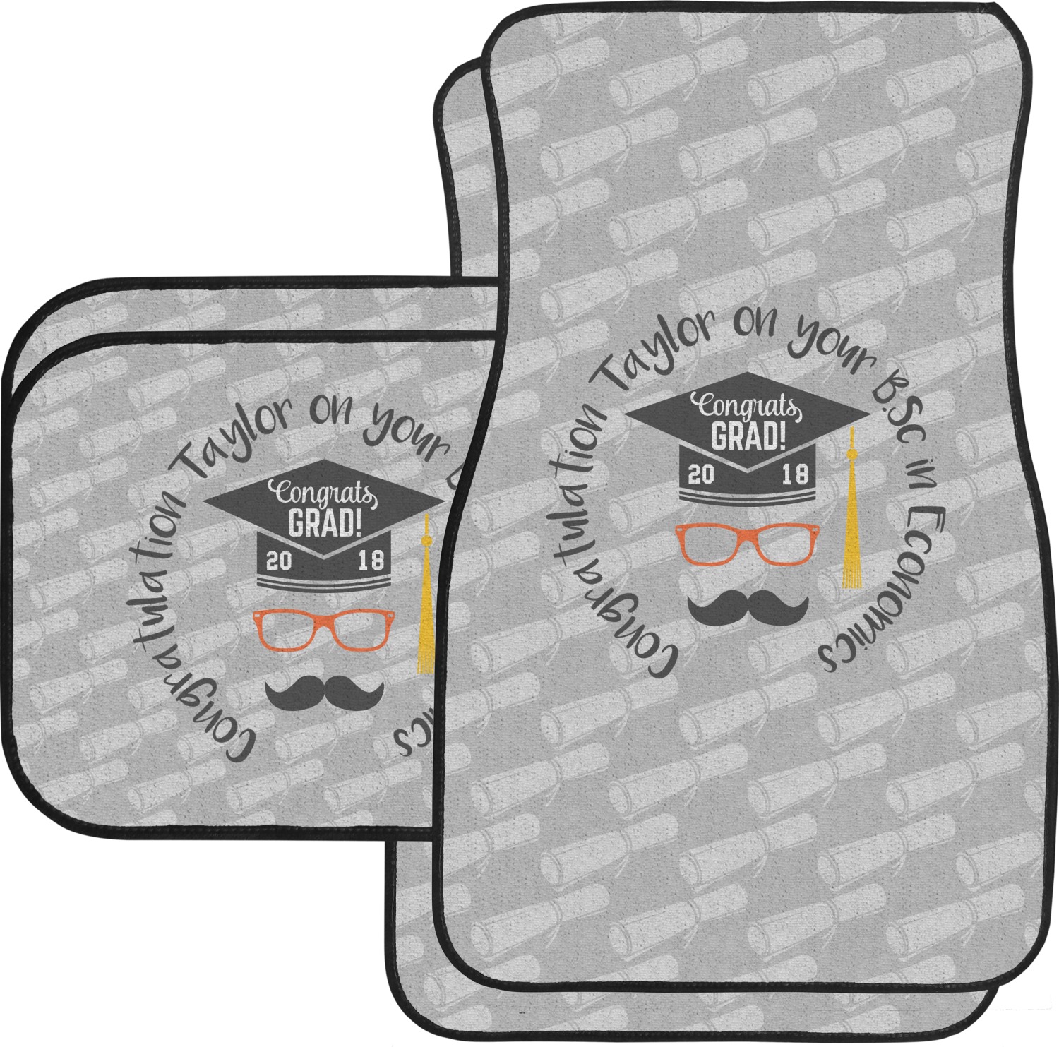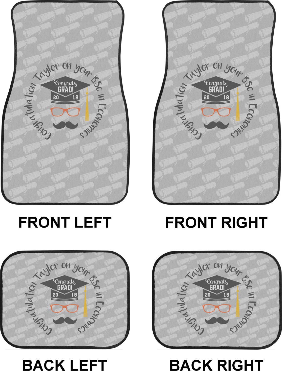 We craft our auto floor mats mats from polyester, apply a black finish to the edges, and lined at the bottom to prevent slippage. These mats protect your floors from grass, mud, and any accidental spills. We display your personalized design on the front face of each mat. The sizes of these car floor liners are standardized to provide a versatile fit for all vehicles. The front rows car mats measure at 17 by 26.5 inches, while the back rows measure at 17 by 13 inches. We sell three packages of car floor mats. You can purchase a pair of front row car mats, a pair of back row car mats, or a set of front row and back row car mats. To make an informed purchase, we recommend measuring the surface area of your car floors.