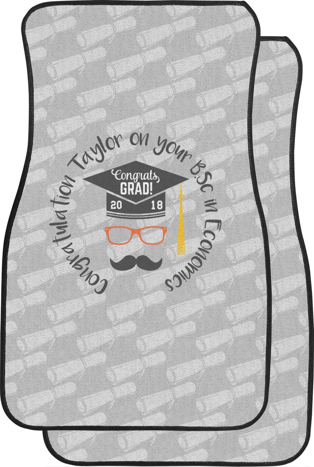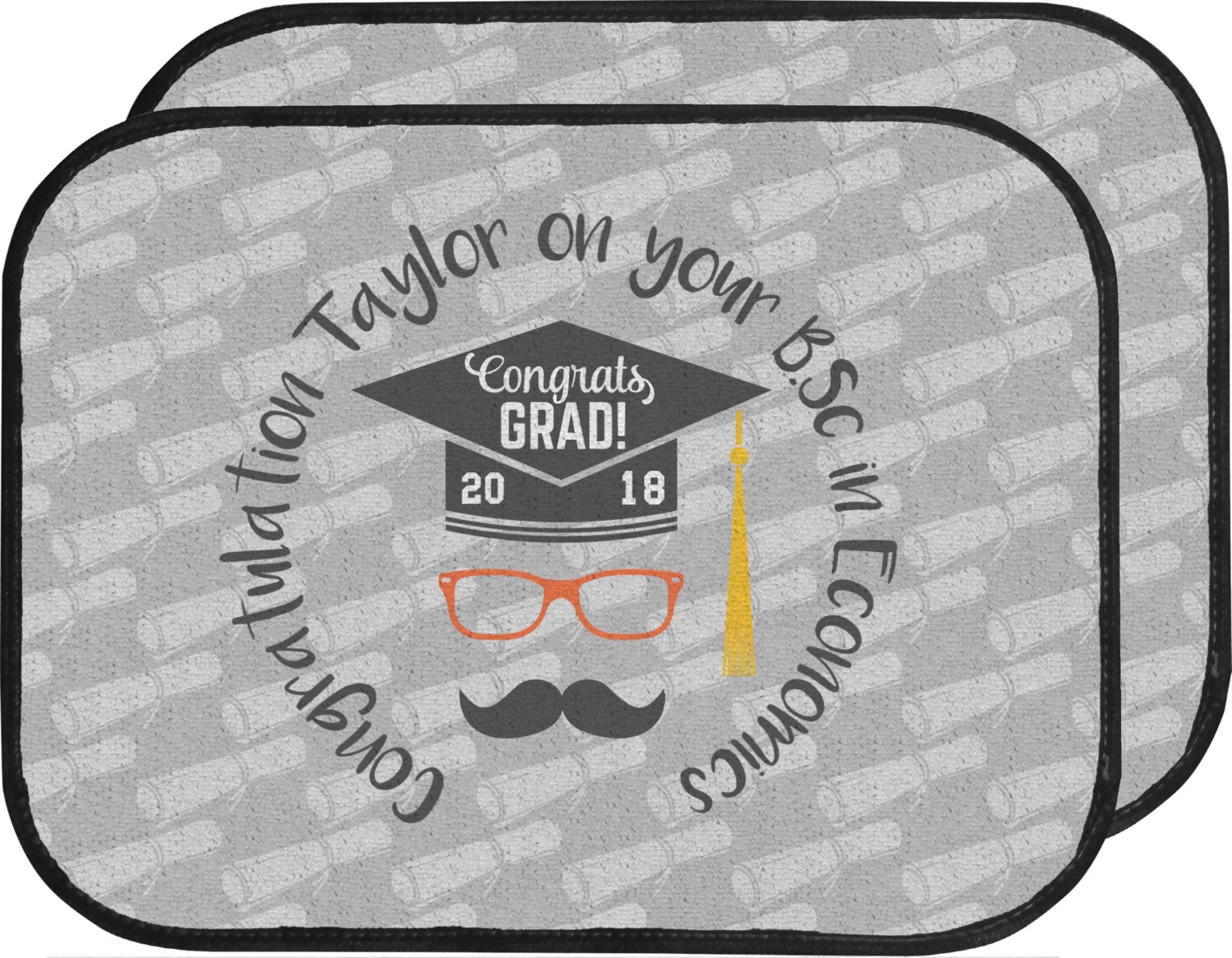 This whimsical and fun design makes the perfect graduation gift. We chose a tone on tone background with graduation scrolls and chose a light grey color. We chose graphic with circular text for our personalization style; change the text to suit your graduate. Customize the colors in the hipster graphic including the glasses, tassel and mustache color. We have other graduate backgrounds as well as graduate graphic in our system. So go ahead and change things to suit your graduate.