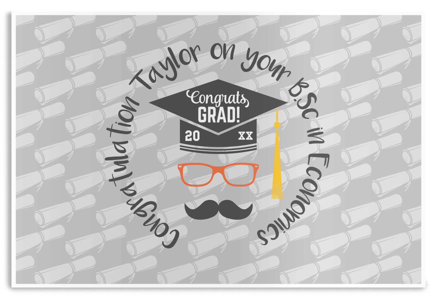 This whimsical and fun design makes the perfect graduation gift. We chose a tone on tone background with graduation scrolls and chose a light grey color. We chose graphic with circular text for our personalization style; change the text to suit your graduate. Customize the colors in the hipster graphic including the glasses, tassel and mustache color. We have other graduate backgrounds as well as graduate graphic in our system. So go ahead and change things to suit your graduate.