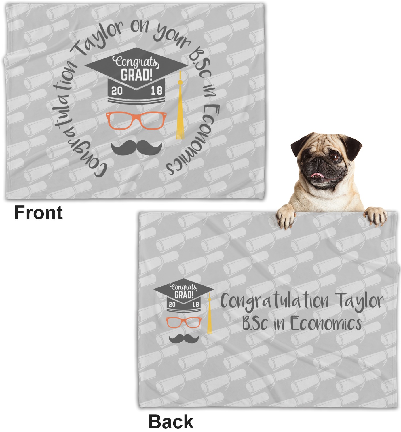 These dog blankets are crafted from a gentle, soft-to-the-touch, minky material. We print your customizations, either matching or differing, on both the top and underside of the blanket. These personalized dog blankets are available in two sizes: regular and large. Our regular size, at 40" x 30", accommodates small and some medium size dogs. At 60" x 50", our large dog blanket is a better fit for bigger breeds. Though specialized for dogs, these blankets still make a thoughtful gift for your favorite feline, or any other pet in mind!