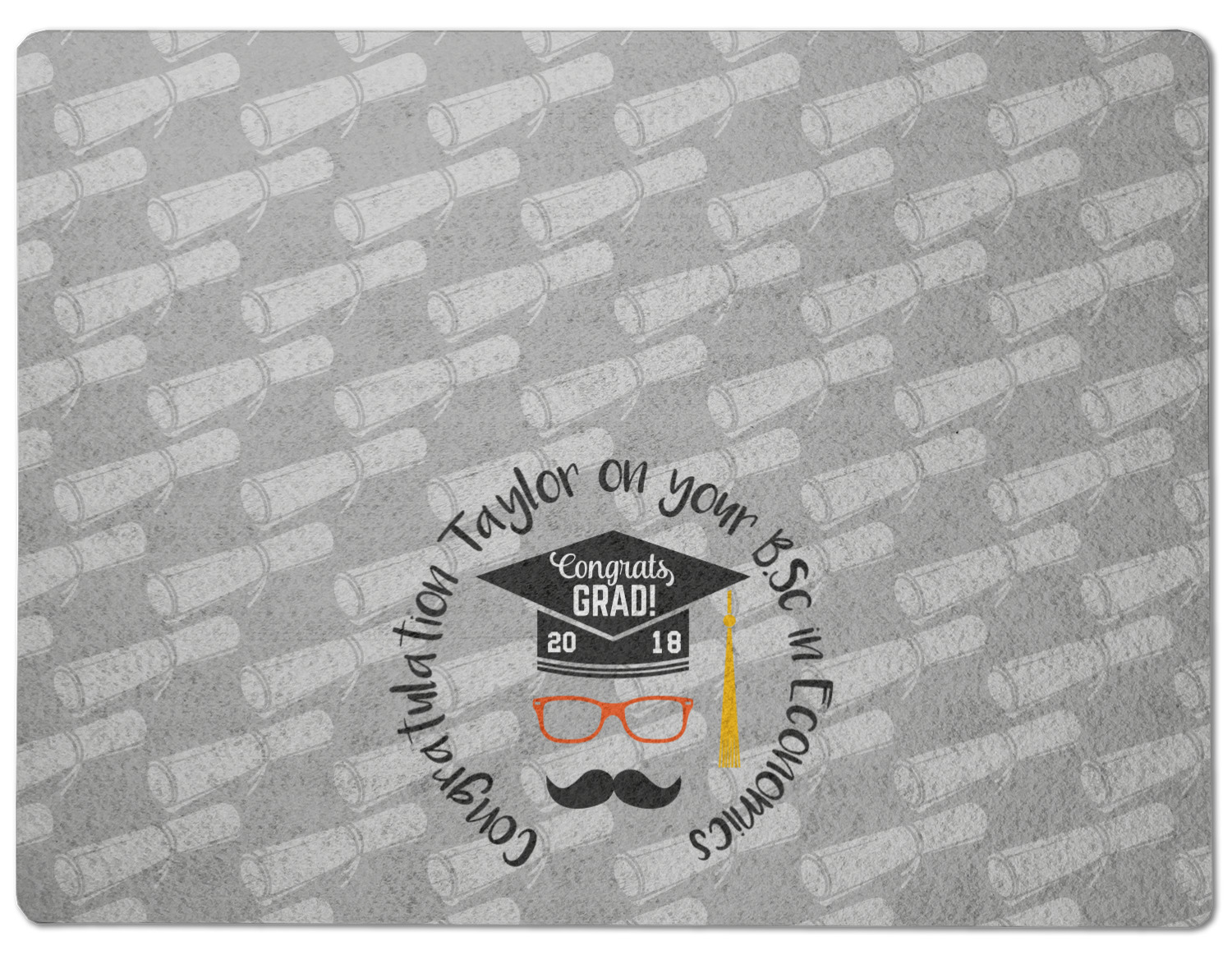 This whimsical and fun design makes the perfect graduation gift. We chose a tone on tone background with graduation scrolls and chose a light grey color. We chose graphic with circular text for our personalization style; change the text to suit your graduate. Customize the colors in the hipster graphic including the glasses, tassel and mustache color. We have other graduate backgrounds as well as graduate graphic in our system. So go ahead and change things to suit your graduate.
