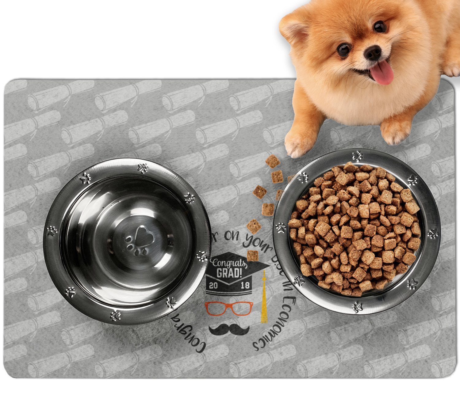 This dog bowl mat, fabricated from polyester, proudly displays your customized design on its top, while its bottom includes a non-slip rubber. This feature allows it to remain firmly in place, even when your dog spills his/her water. With 3 sizes available (18" x 12", 24" x 18", 30" x 24"), the pet food mat has ample space for both a food and water bowl for any sized dogs. Though specified for dogs' use, these mats are also a splendid option for cats.