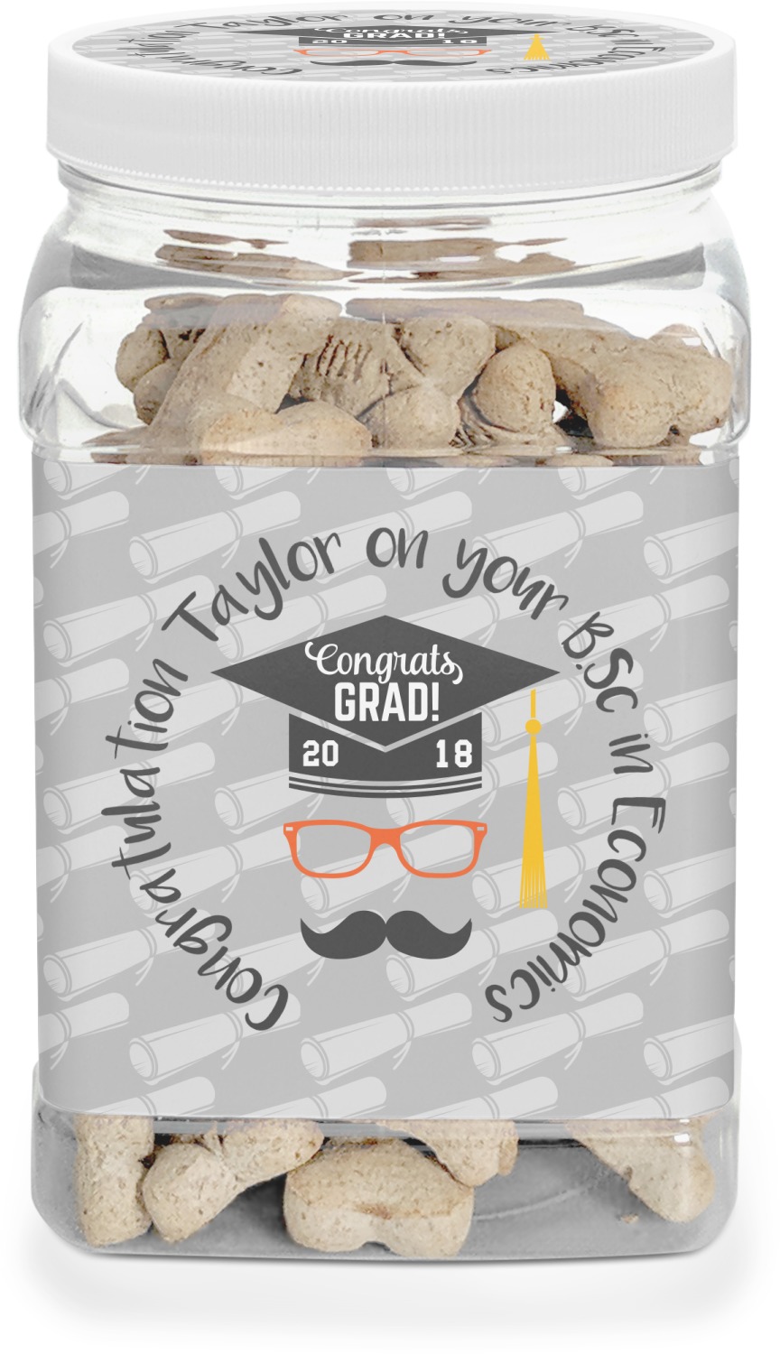 This half gallon jar, made from a sturdy plastic, is the perfect way to keep treats from any naughty pet paws, while still keeping them ready on hand for when your pup performs an impressive trick. This dog cookie jar features a screw-on, white lid that displays your personalized design on a vinyl sticker. We apply another customized sticker that wraps around the front and sides of the jar. Our dog treat jar also has indentations on the rear ends of the sides, which allows for convenient handling, and its square frame allows for easy storage.