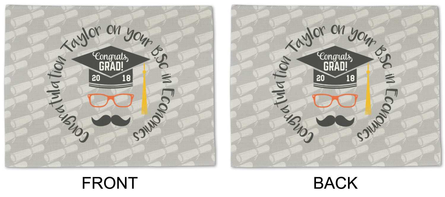 This whimsical and fun design makes the perfect graduation gift. We chose a tone on tone background with graduation scrolls and chose a light grey color. We chose graphic with circular text for our personalization style; change the text to suit your graduate. Customize the colors in the hipster graphic including the glasses, tassel and mustache color. We have other graduate backgrounds as well as graduate graphic in our system. So go ahead and change things to suit your graduate.