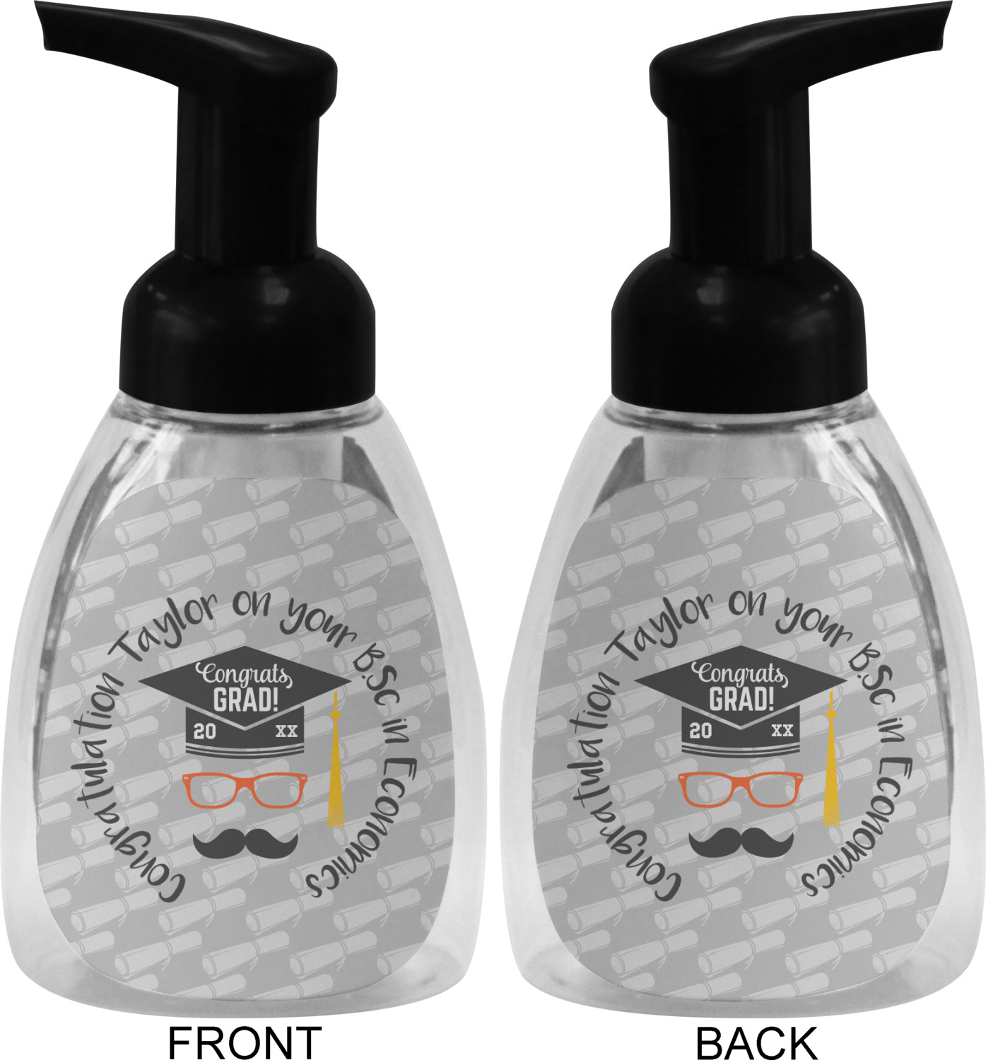 This soap dispenser is made of a robust plastic and has a clear base. The included soap pump is available in black or white color. This dispenser is 6.5 inches tall, 3 inches wide, and 2 inches deep. We display your customized designs on the front and back sides of these foaming hand soap dispensers.