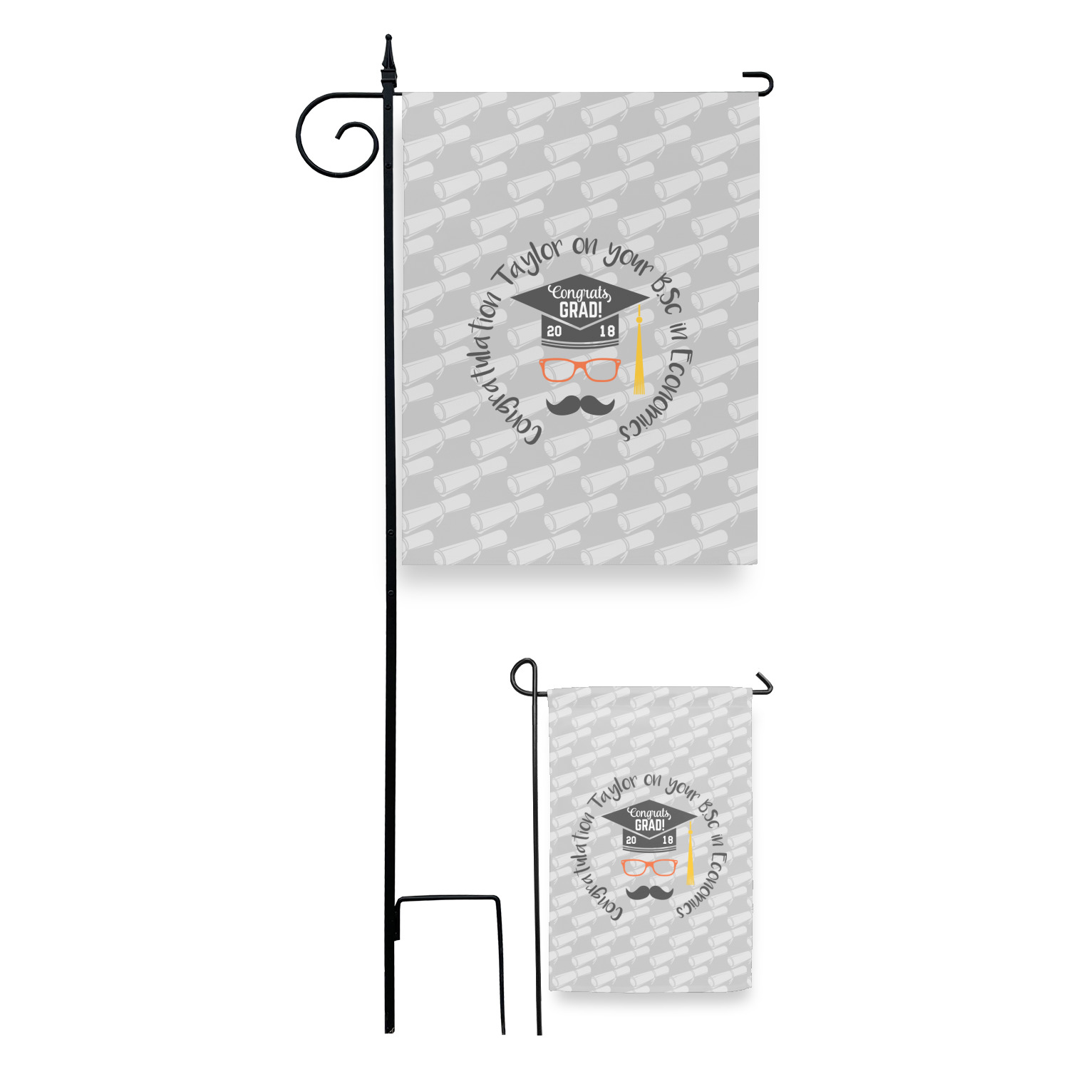 These custom garden flags are made of a durable, double-ply, polyester weave, allowing them to withstand the elements year round. The small flags measure at approximately 12 by 18 inches. The large flags measure out to 28 by 37 inches. You can order these decorative flags with your customization printed on the front only, or the front and back.