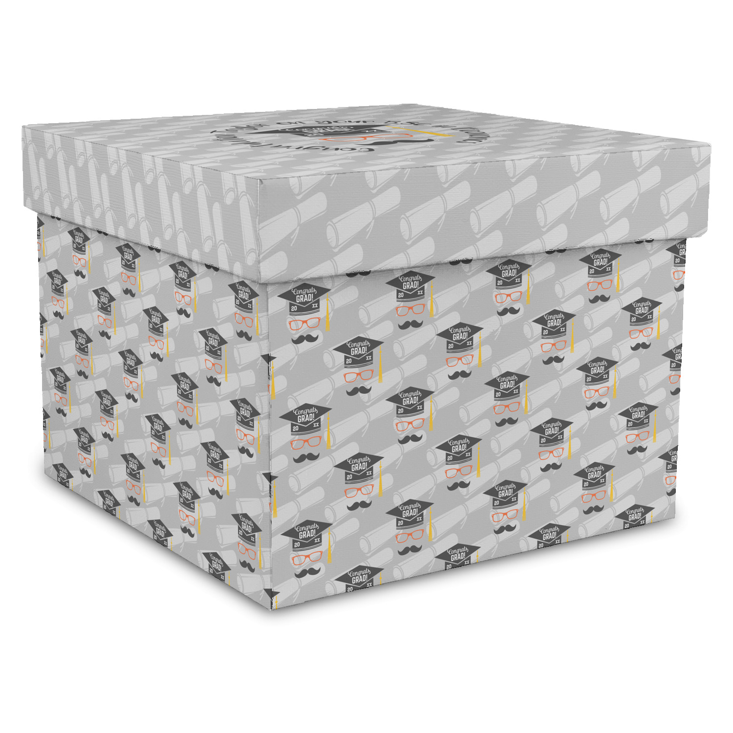 This whimsical and fun design makes the perfect graduation gift. We chose a tone on tone background with graduation scrolls and chose a light grey color. We chose graphic with circular text for our personalization style; change the text to suit your graduate. Customize the colors in the hipster graphic including the glasses, tassel and mustache color. We have other graduate backgrounds as well as graduate graphic in our system. So go ahead and change things to suit your graduate.