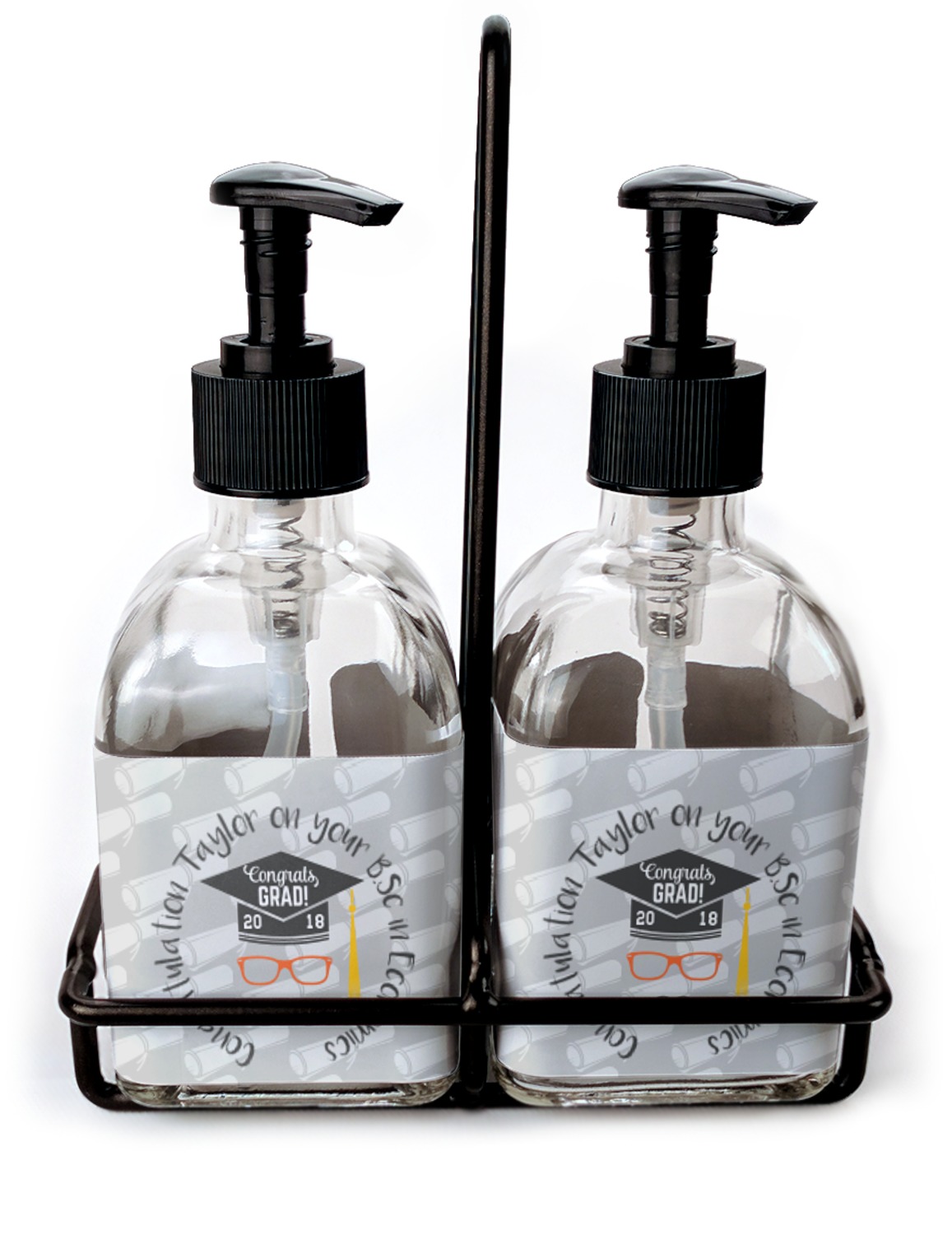 You can purchase these personalized soap dispensers as singulars, or as a set with two bottles. With your purchase of the set, we include a black frame that complements the black color of the pumps and adds to the overall classy look of the piece.
