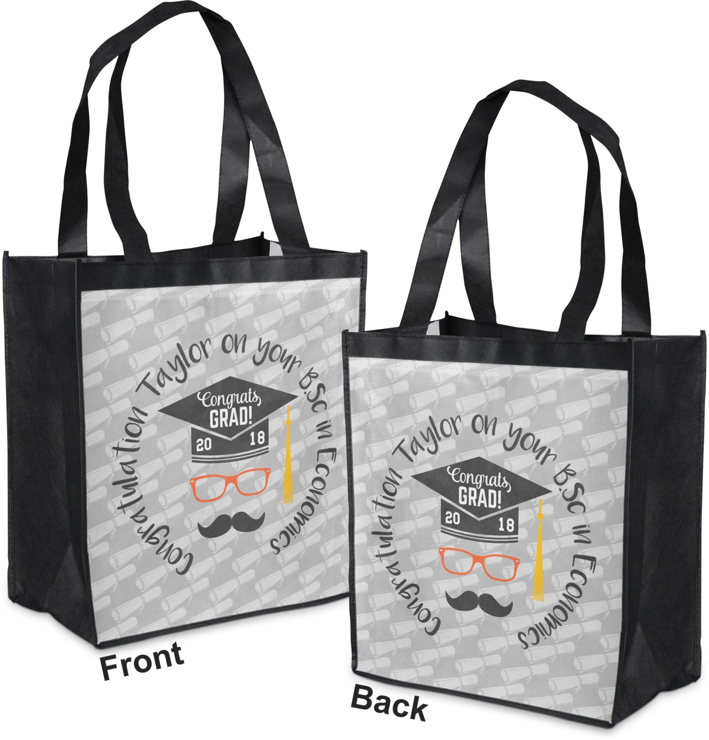 Made from a durable, biodegradable material, these reusable shopping bags can support up to 30 pounds of weight. With two large handles, measuring at 8.5 inches each, these personalized tote bags are easy to carry to your vehicle or home. The bag itself is 12 by 13.5 inches, and can expand to a depth of 7 inches. Your customization is printed on both the front and back, while the remaining sides, trim, and handle are a sleek, charcoal black.