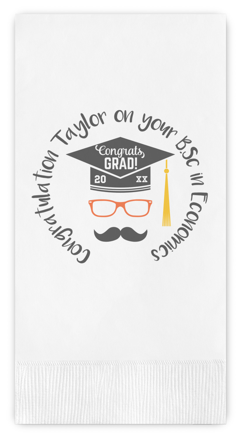 This whimsical and fun design makes the perfect graduation gift. We chose a tone on tone background with graduation scrolls and chose a light grey color. We chose graphic with circular text for our personalization style; change the text to suit your graduate. Customize the colors in the hipster graphic including the glasses, tassel and mustache color. We have other graduate backgrounds as well as graduate graphic in our system. So go ahead and change things to suit your graduate.