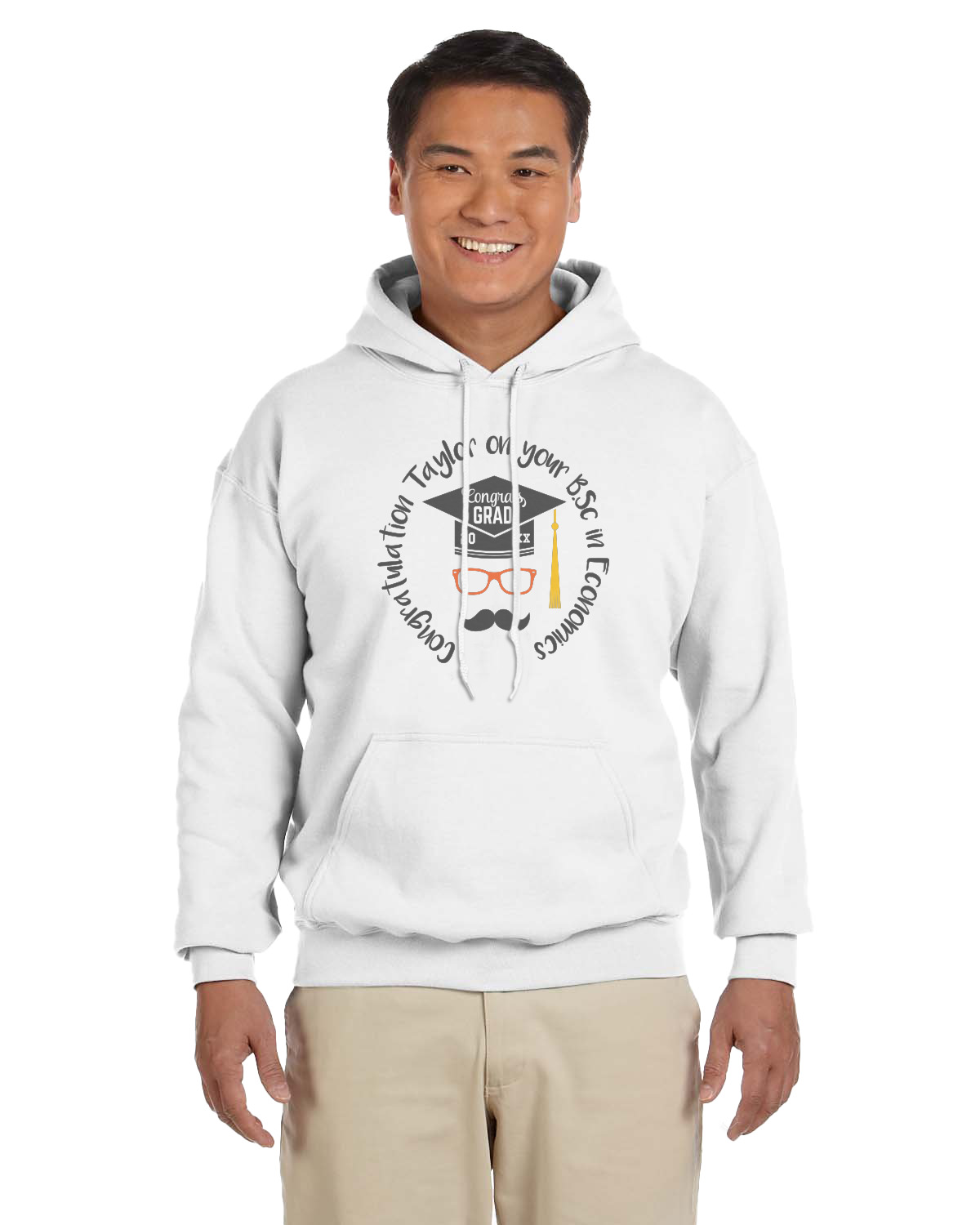 This whimsical and fun design makes the perfect graduation gift. We chose a tone on tone background with graduation scrolls and chose a light grey color. We chose graphic with circular text for our personalization style; change the text to suit your graduate. Customize the colors in the hipster graphic including the glasses, tassel and mustache color. We have other graduate backgrounds as well as graduate graphic in our system. So go ahead and change things to suit your graduate.