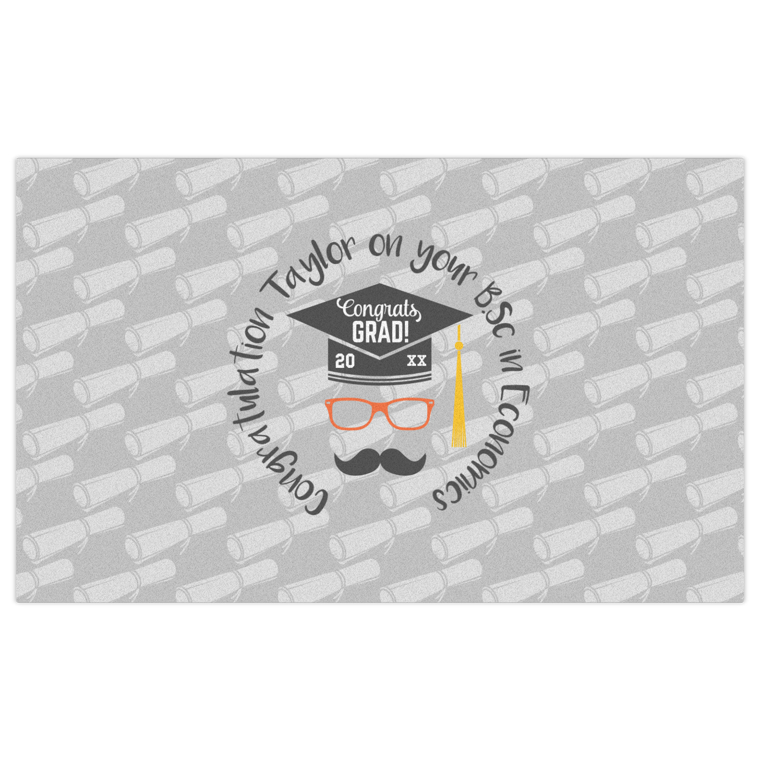 This whimsical and fun design makes the perfect graduation gift. We chose a tone on tone background with graduation scrolls and chose a light grey color. We chose graphic with circular text for our personalization style; change the text to suit your graduate. Customize the colors in the hipster graphic including the glasses, tassel and mustache color. We have other graduate backgrounds as well as graduate graphic in our system. So go ahead and change things to suit your graduate.