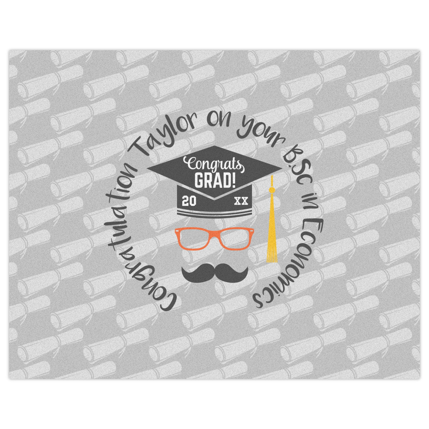 This whimsical and fun design makes the perfect graduation gift. We chose a tone on tone background with graduation scrolls and chose a light grey color. We chose graphic with circular text for our personalization style; change the text to suit your graduate. Customize the colors in the hipster graphic including the glasses, tassel and mustache color. We have other graduate backgrounds as well as graduate graphic in our system. So go ahead and change things to suit your graduate.