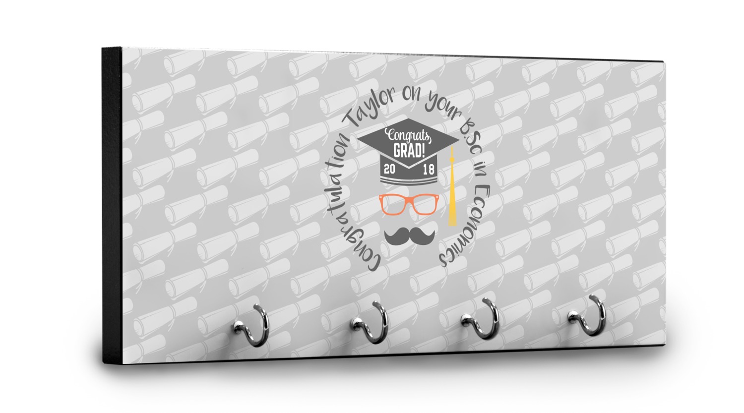 This whimsical and fun design makes the perfect graduation gift. We chose a tone on tone background with graduation scrolls and chose a light grey color. We chose graphic with circular text for our personalization style; change the text to suit your graduate. Customize the colors in the hipster graphic including the glasses, tassel and mustache color. We have other graduate backgrounds as well as graduate graphic in our system. So go ahead and change things to suit your graduate.