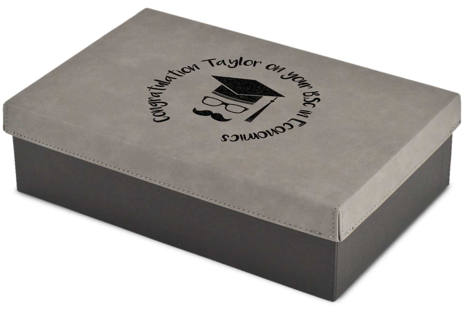These gift boxes are available in 3 different sizes to accommodate various sized gifts. Available in gray as a neutral color for any occasion as well as to showcase your design boldly. Engraved with a laser this high quality paper board and faux leather gift box is unique and makes any gift stand out.