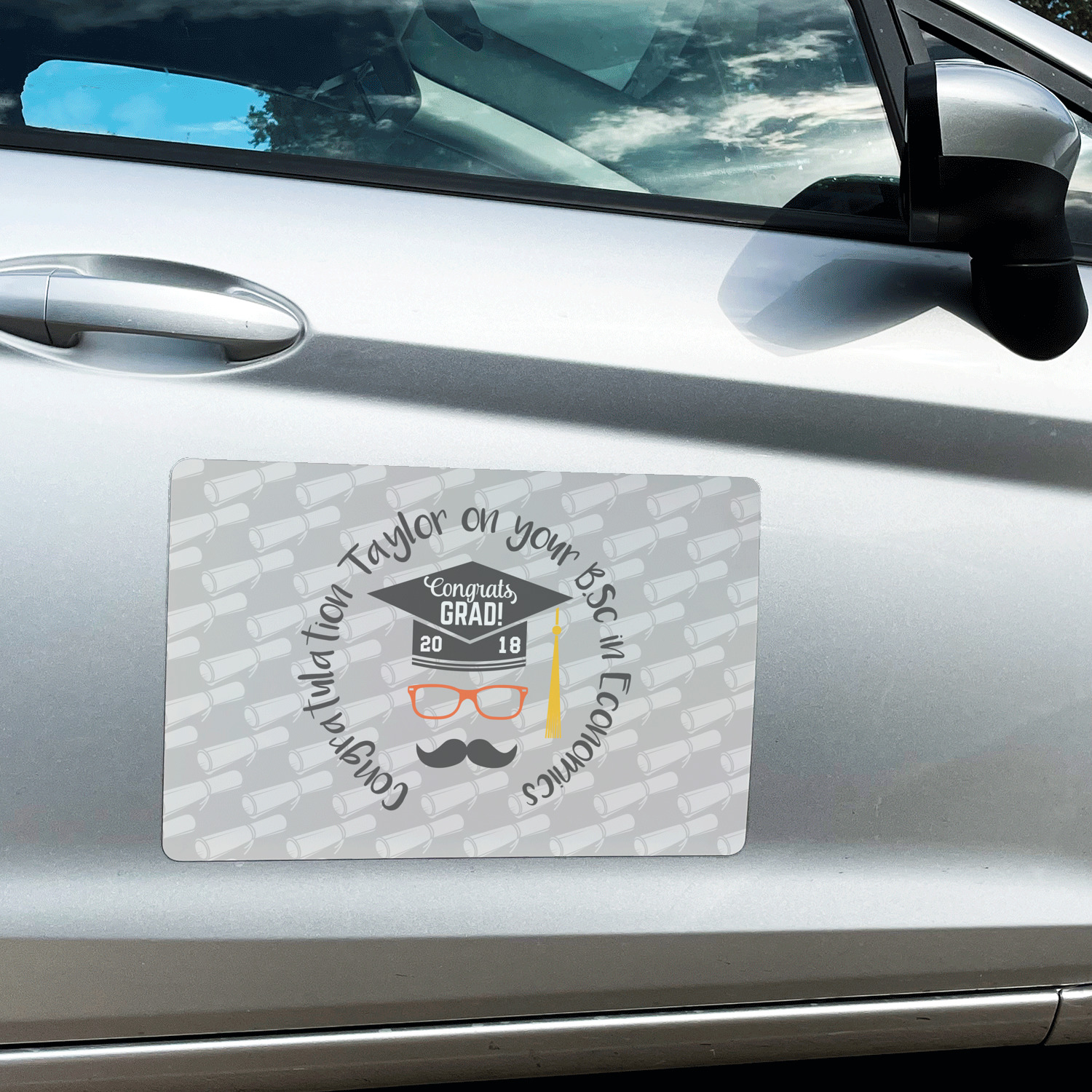 Your personalized large car magnet measures at 18 inches wide by 12 inches tall. They are 1 millimeter thick, which is considered, within the industry, as the ideal thickness for automobile magnets. The magnetic car decals will adhere to any smooth, ferrous metal surface of your cars body, such as the trunk door or a side panel.