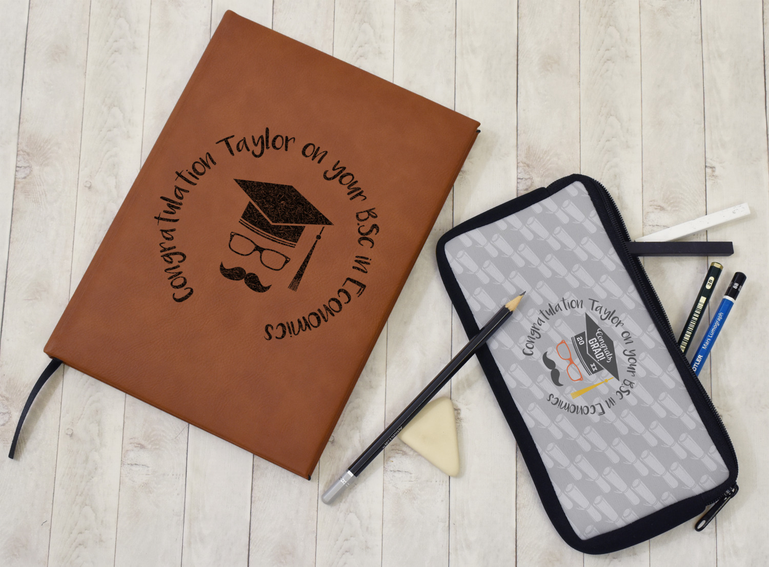 This whimsical and fun design makes the perfect graduation gift. We chose a tone on tone background with graduation scrolls and chose a light grey color. We chose graphic with circular text for our personalization style; change the text to suit your graduate. Customize the colors in the hipster graphic including the glasses, tassel and mustache color. We have other graduate backgrounds as well as graduate graphic in our system. So go ahead and change things to suit your graduate.