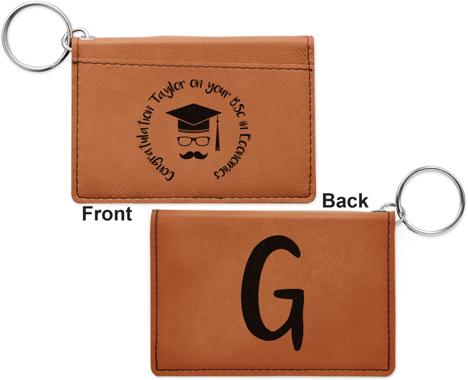 These ID wallet keychains features three pockets on the inside to accommodate your ID and your most frequently used cards. Another pocket occupies the front of the wallet's exterior, and can hold some cash or another card. The wallet is accompanied by a thick metal ring for easy attachment to a belt clip or purse. Each card holder keychain measures at 4.25 by 3 inches and is a beautiful, cognac, medium-brown shade. The personalized monogram, font, or graphic of your choosing is laser engraved into the surface of the wallet, creating a black imprint. We sell these ID wallets in two models: single sided and double sided engraving.