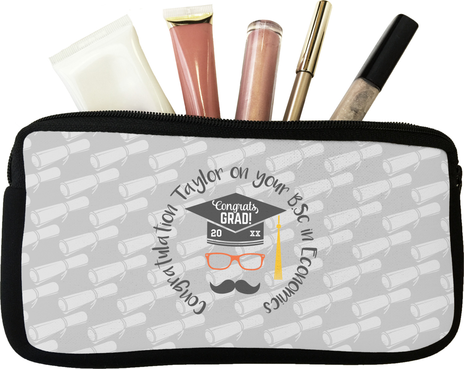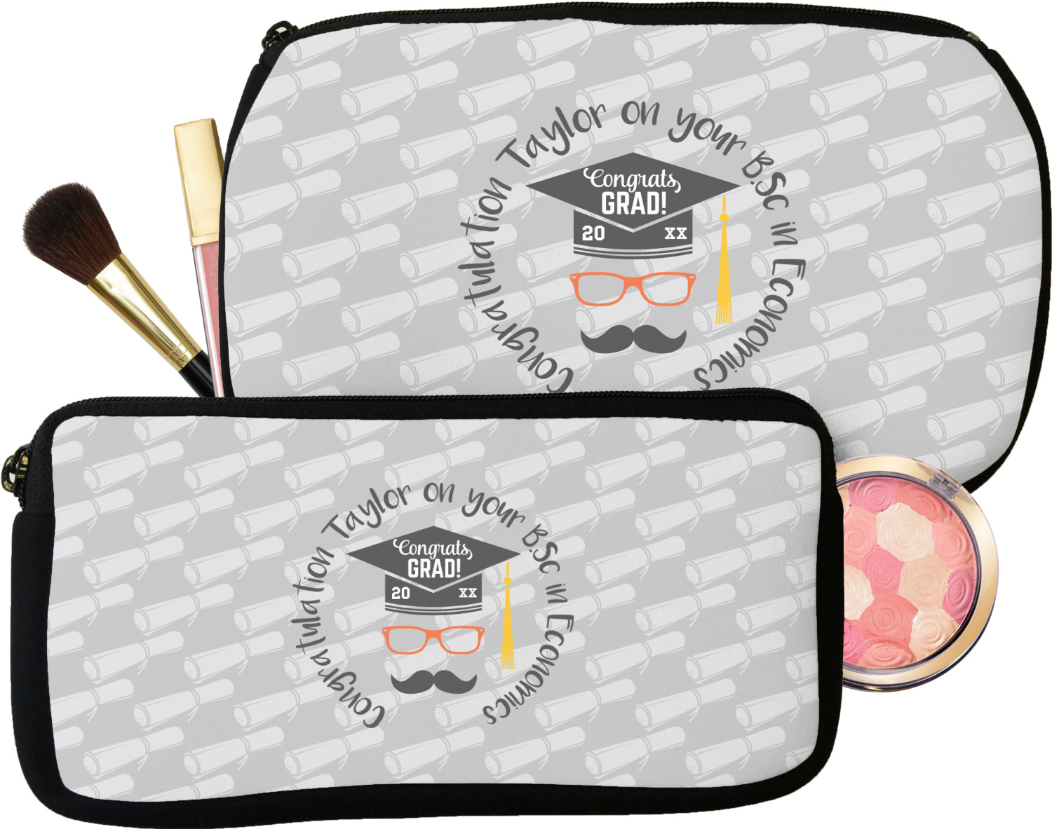 Our personalized makeup bags are available in many different designs, patterns and colors - so you are sure to find one that will love. They are made of neoprene (same material as wet-suits) and thus are water resistant, so spillages in your makeup bag will not end up all over you purse. They are customized on one side and are black on the other side and the zipper is black as well.