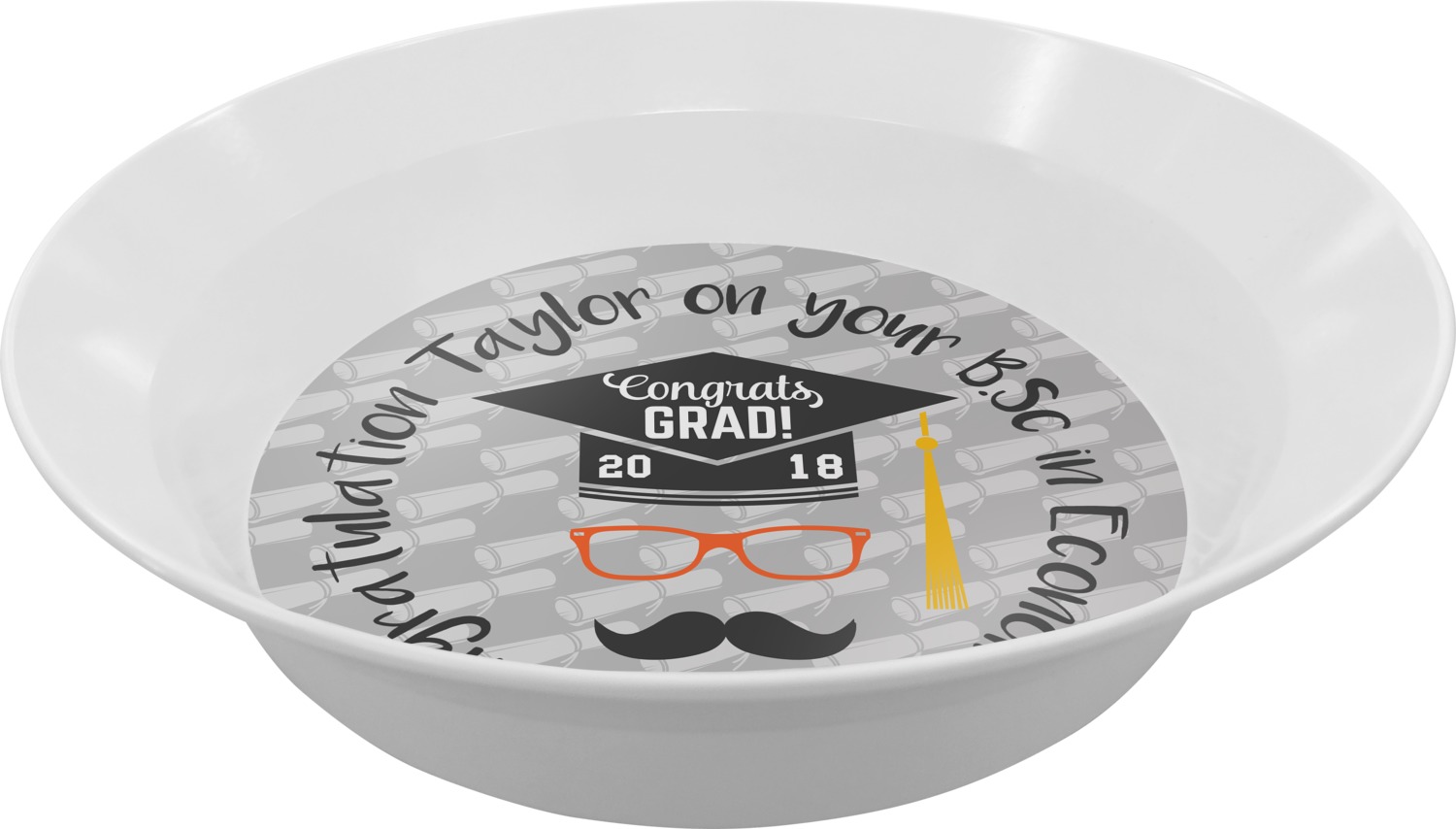 Our melamine dinnerware are BPA free, break-resistant, and dishwasher safe. Our first model has a more functional, standard look, and can hold up to 8 ounces of liquid. The second version we offer has a tapered edge and can hold up to 12 ounces of liquid. Both bowls display your customization on the base of the bowl's inside, and the exterior of the two models are both white.