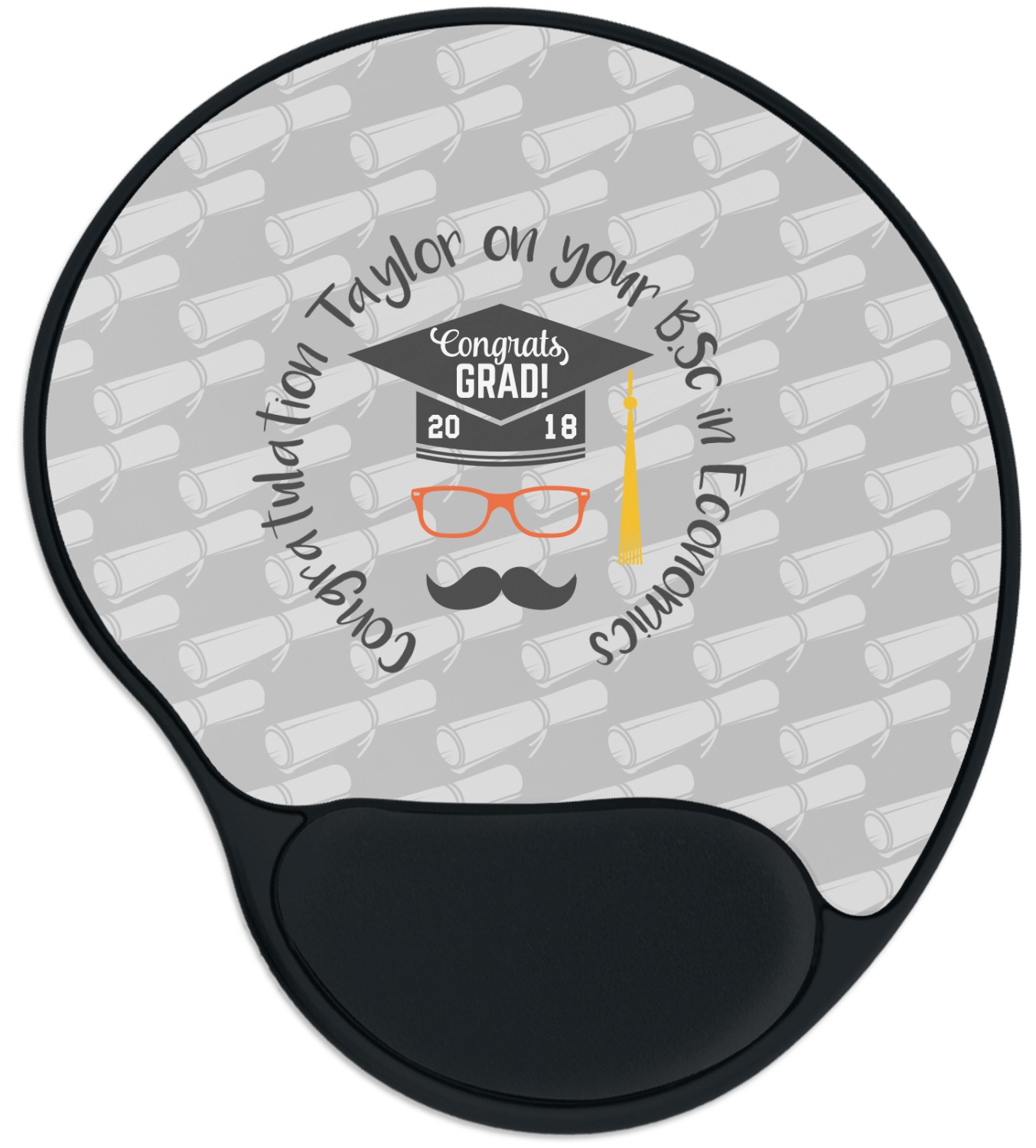 The top of these personalized mouse pads are made from a polyester, while the underside is plastic. The back of these mouse mats include rubber feet to prevent any slippage while in use. A padded wrist support, made from plush memory foam, occupies the bottom section of these computer mouse pads. Your customized design is printed onto the face of this mat, with the remaining sides and support piece colored in black. The mat itself is rounded and measures at 10.25" x 9.13".