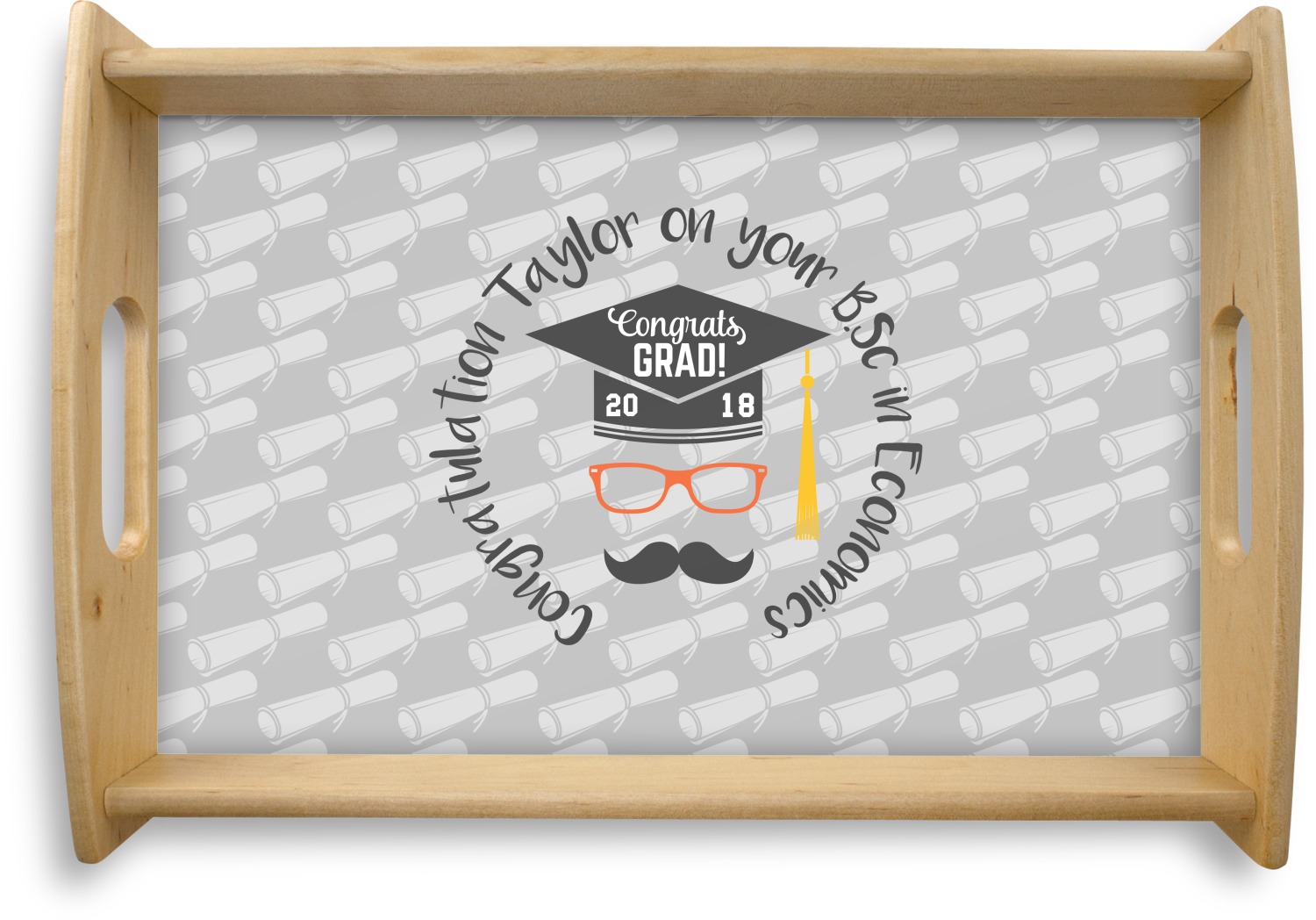 This serving tray with handles features square edges and two rounded sides, creating a very modern look. Each side is fabricated from a beautifully cut, natural wood. The bottom of the interior of the tray displays your customized design in bright, vibrant color. The tray is sold in both a black color and a natural wood look. Each variation of the wood serving tray has two sizes: Small, which is 14" x 10" x 2.25", and Large, which is 19.5" x 13.5" x 2.75".