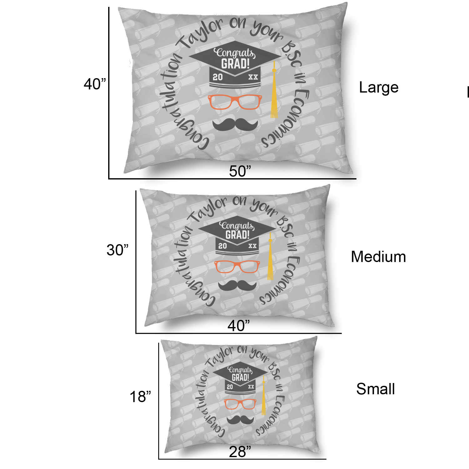 This whimsical and fun design makes the perfect graduation gift. We chose a tone on tone background with graduation scrolls and chose a light grey color. We chose graphic with circular text for our personalization style; change the text to suit your graduate. Customize the colors in the hipster graphic including the glasses, tassel and mustache color. We have other graduate backgrounds as well as graduate graphic in our system. So go ahead and change things to suit your graduate.