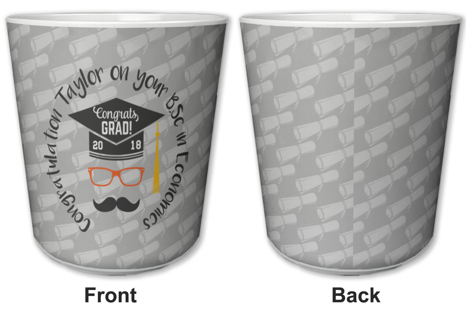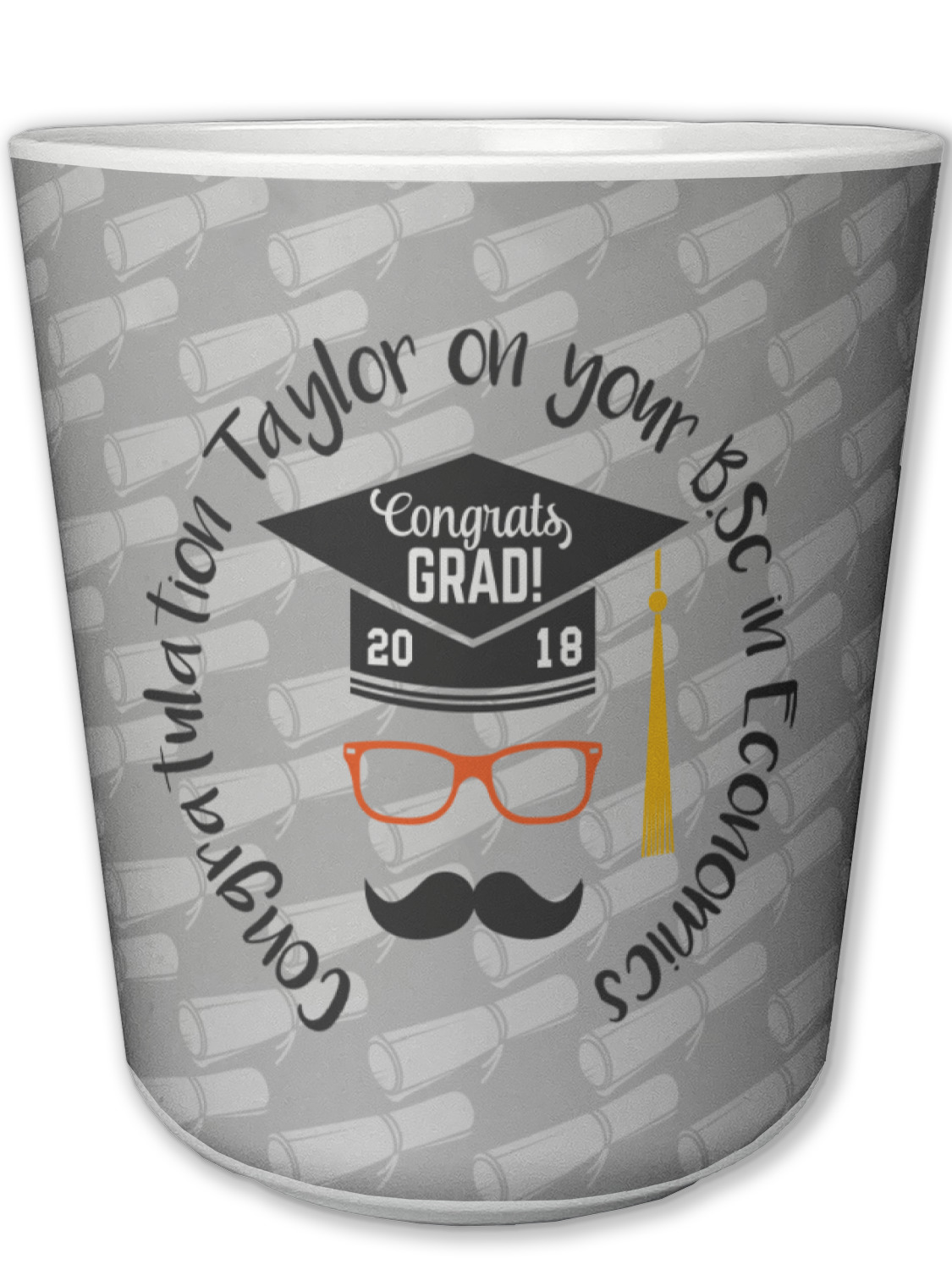 This whimsical and fun design makes the perfect graduation gift. We chose a tone on tone background with graduation scrolls and chose a light grey color. We chose graphic with circular text for our personalization style; change the text to suit your graduate. Customize the colors in the hipster graphic including the glasses, tassel and mustache color. We have other graduate backgrounds as well as graduate graphic in our system. So go ahead and change things to suit your graduate.
