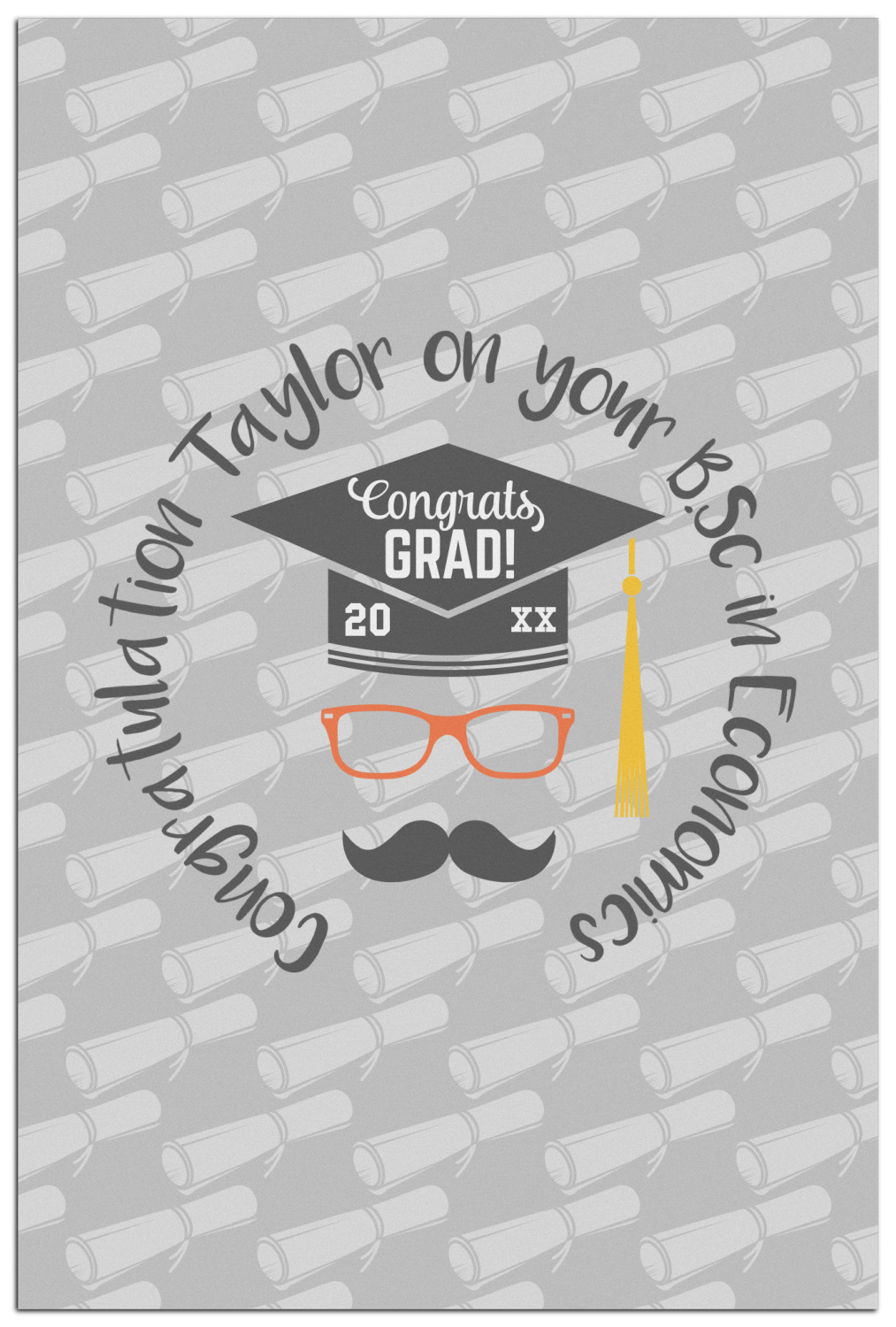 This whimsical and fun design makes the perfect graduation gift. We chose a tone on tone background with graduation scrolls and chose a light grey color. We chose graphic with circular text for our personalization style; change the text to suit your graduate. Customize the colors in the hipster graphic including the glasses, tassel and mustache color. We have other graduate backgrounds as well as graduate graphic in our system. So go ahead and change things to suit your graduate.