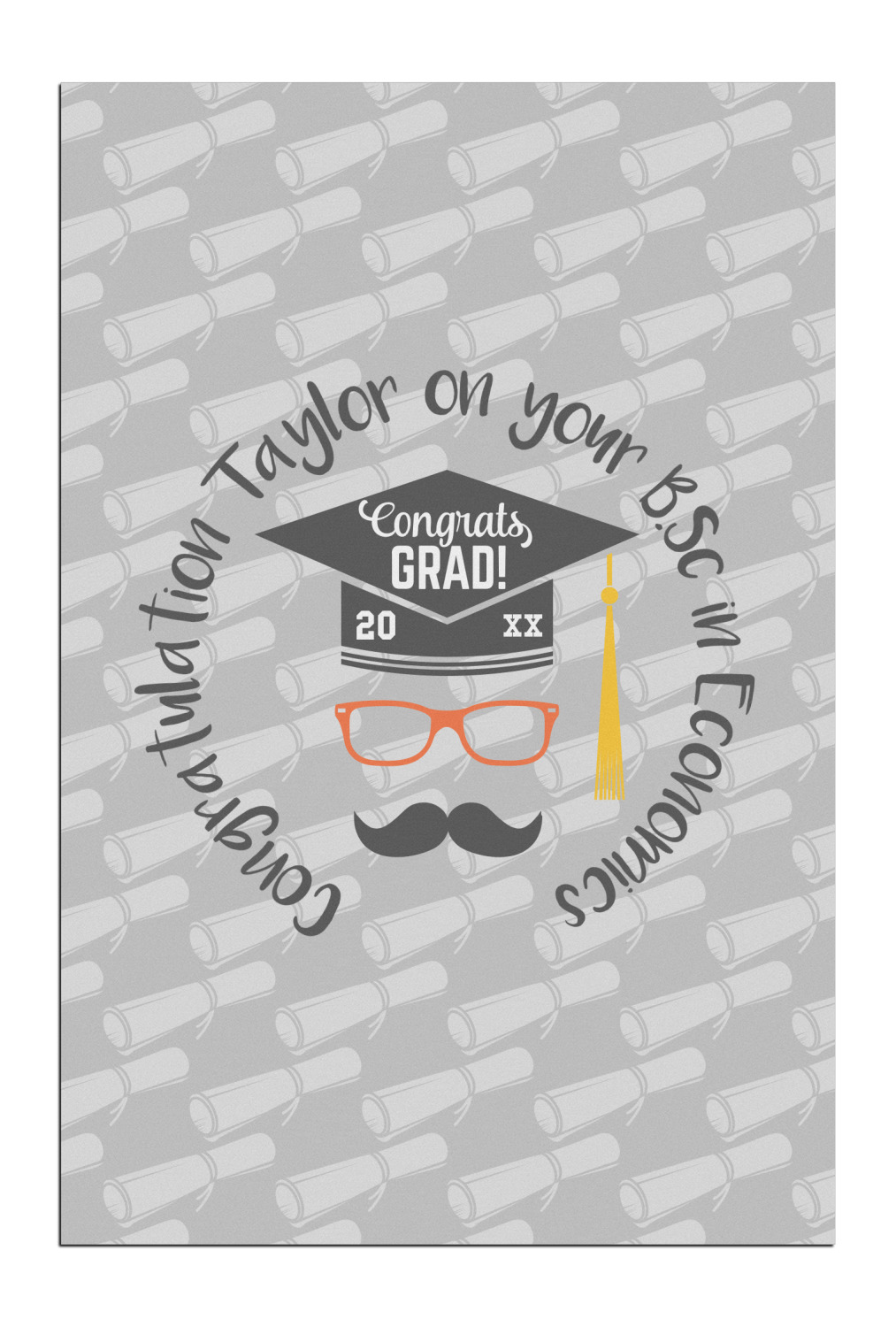 This whimsical and fun design makes the perfect graduation gift. We chose a tone on tone background with graduation scrolls and chose a light grey color. We chose graphic with circular text for our personalization style; change the text to suit your graduate. Customize the colors in the hipster graphic including the glasses, tassel and mustache color. We have other graduate backgrounds as well as graduate graphic in our system. So go ahead and change things to suit your graduate.