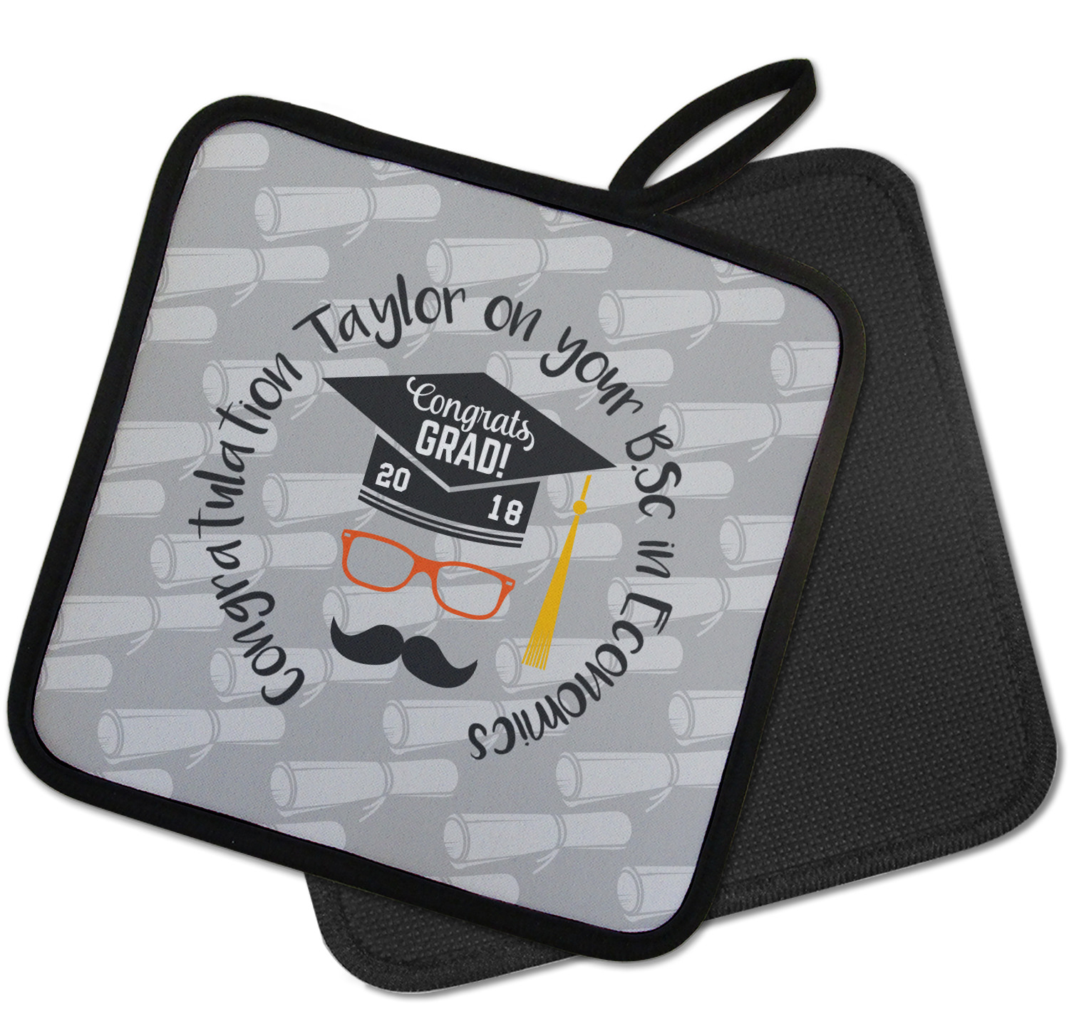 Our personalized pot holders feature a neoprene front that displays your personalization in vibrant colors. The backing of the hot pot holder is rubberized; the textured backing allows you to have a great grip when using this custom pot holder. The two materials are joined with a sleek, black trim, and the holder also includes an attached loop for hanging and storage. The pot holder is approximately 8.75 inches by 8.75 inches and 0.25 inches tall, while the fabric loop is 2.5 inches long. You can purchase a kitchen pot holder by itself or as a set of 2. We also offer a set including one pot holder and one oven mitt.