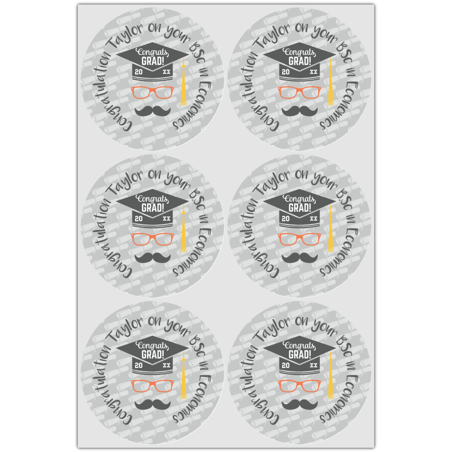This whimsical and fun design makes the perfect graduation gift. We chose a tone on tone background with graduation scrolls and chose a light grey color. We chose graphic with circular text for our personalization style; change the text to suit your graduate. Customize the colors in the hipster graphic including the glasses, tassel and mustache color. We have other graduate backgrounds as well as graduate graphic in our system. So go ahead and change things to suit your graduate.