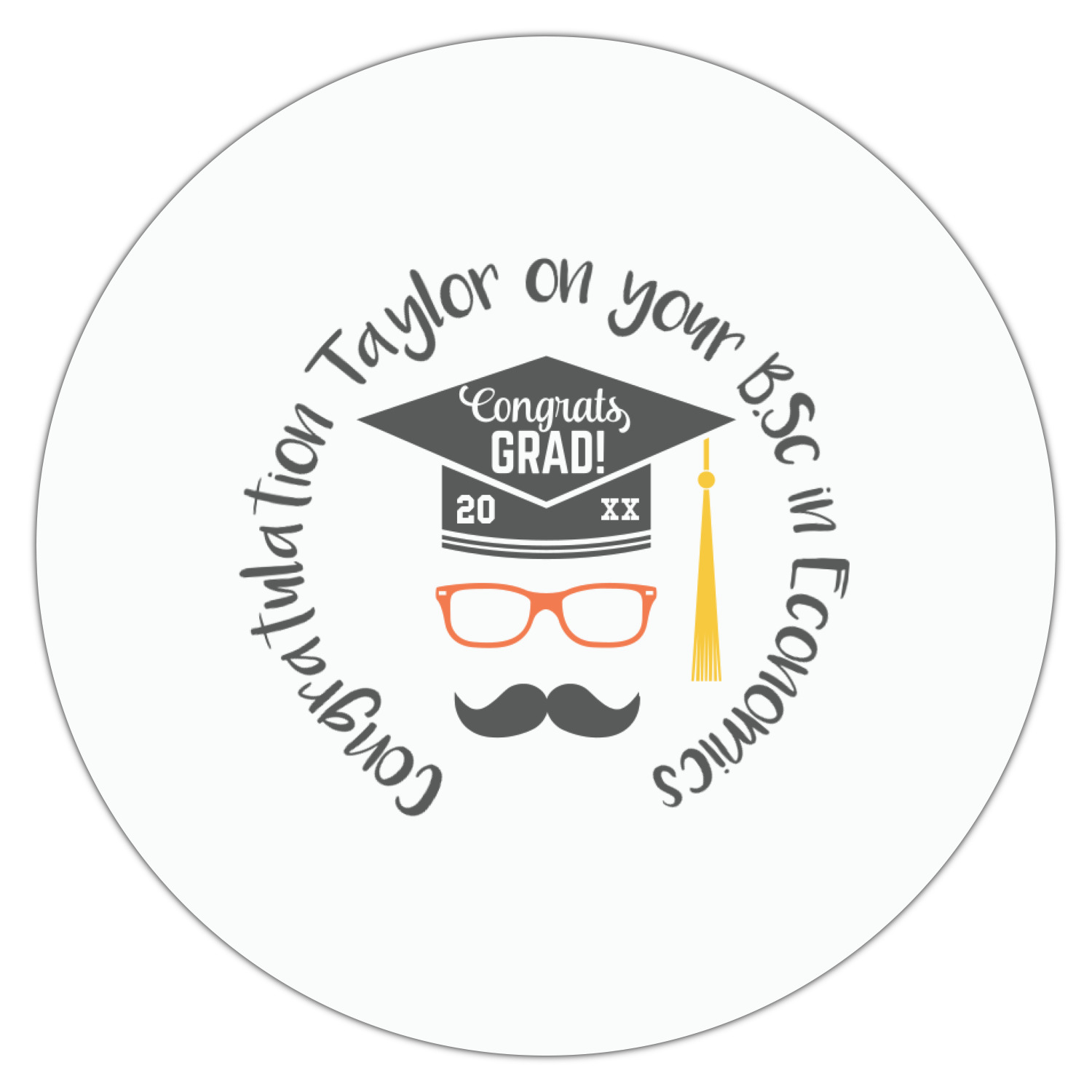This whimsical and fun design makes the perfect graduation gift. We chose a tone on tone background with graduation scrolls and chose a light grey color. We chose graphic with circular text for our personalization style; change the text to suit your graduate. Customize the colors in the hipster graphic including the glasses, tassel and mustache color. We have other graduate backgrounds as well as graduate graphic in our system. So go ahead and change things to suit your graduate.