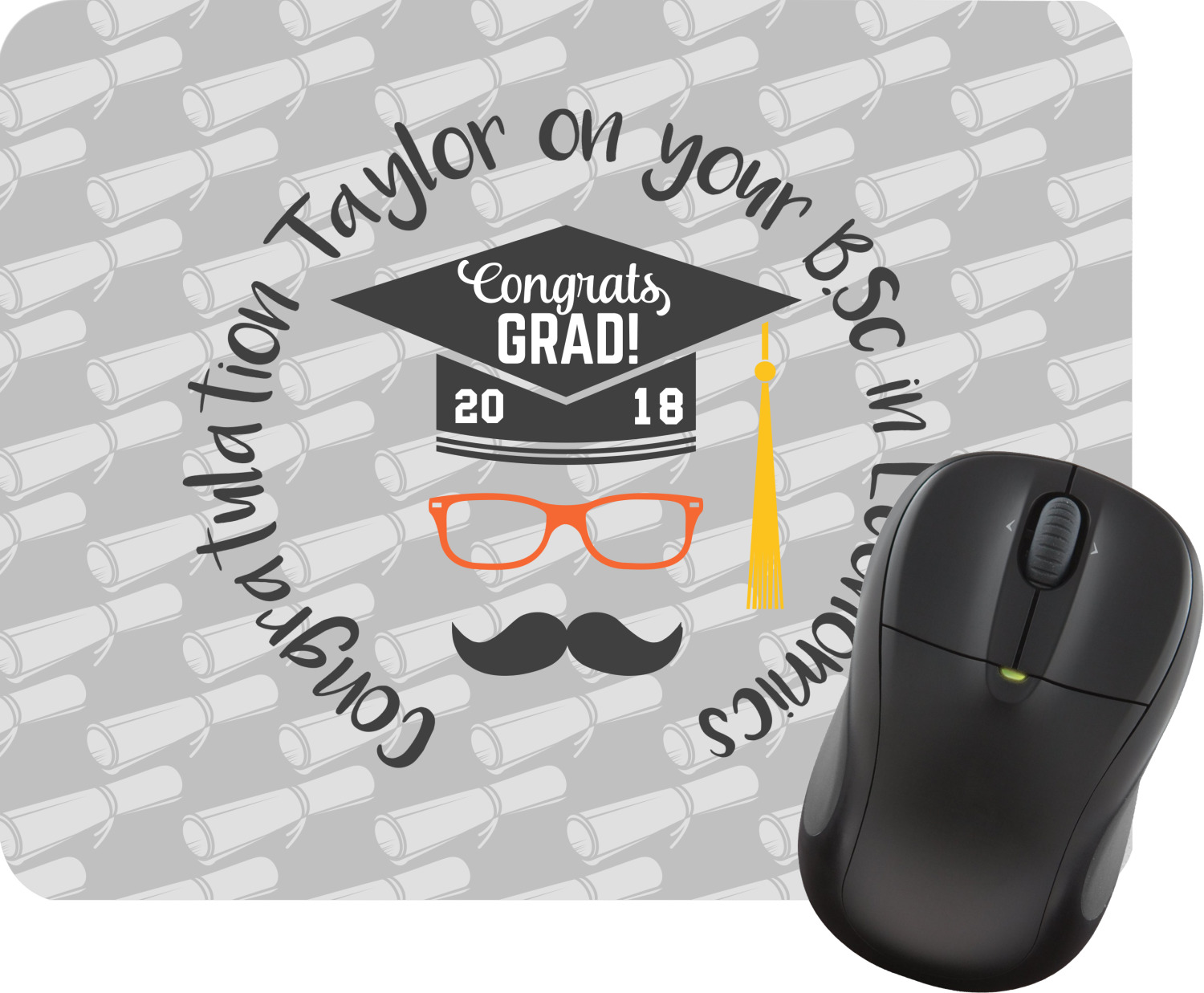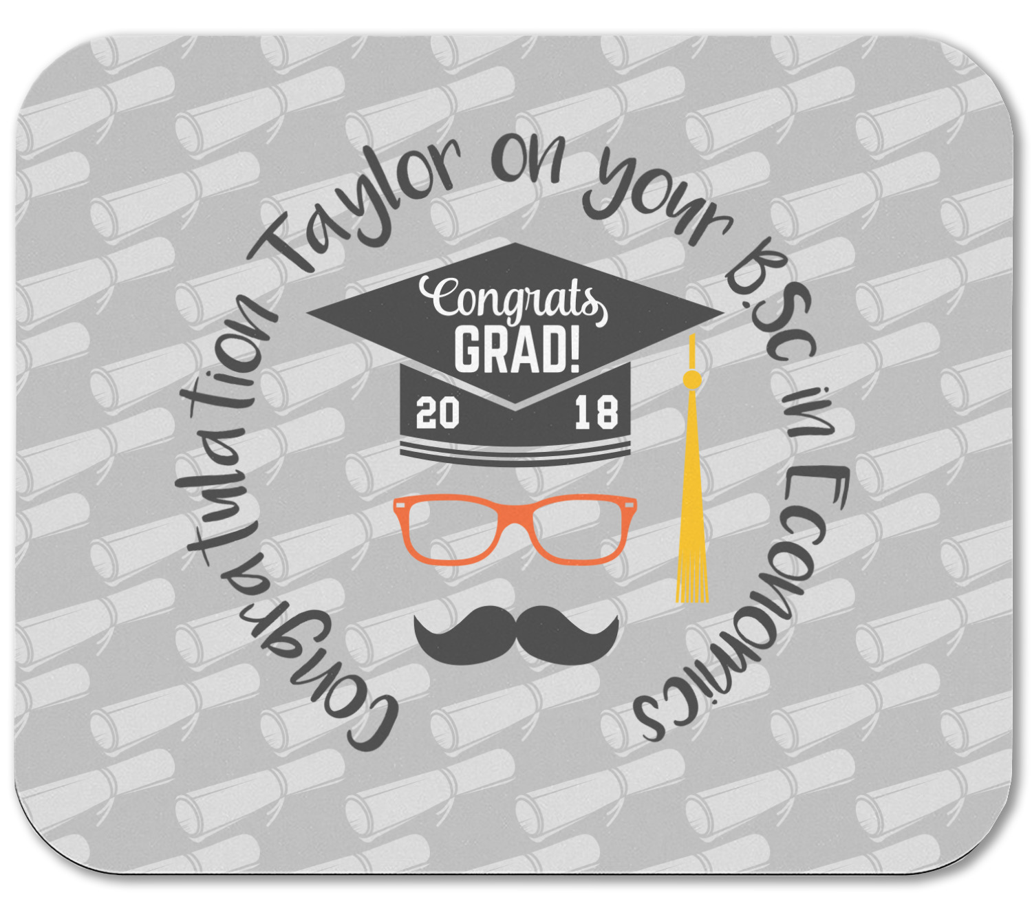 This whimsical and fun design makes the perfect graduation gift. We chose a tone on tone background with graduation scrolls and chose a light grey color. We chose graphic with circular text for our personalization style; change the text to suit your graduate. Customize the colors in the hipster graphic including the glasses, tassel and mustache color. We have other graduate backgrounds as well as graduate graphic in our system. So go ahead and change things to suit your graduate.