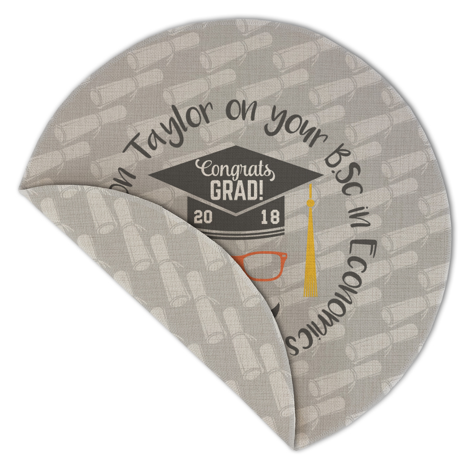 This whimsical and fun design makes the perfect graduation gift. We chose a tone on tone background with graduation scrolls and chose a light grey color. We chose graphic with circular text for our personalization style; change the text to suit your graduate. Customize the colors in the hipster graphic including the glasses, tassel and mustache color. We have other graduate backgrounds as well as graduate graphic in our system. So go ahead and change things to suit your graduate.