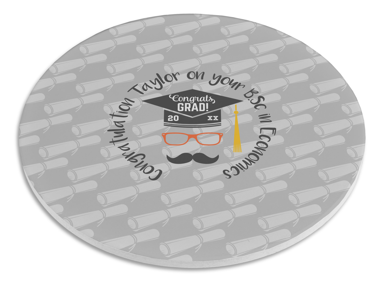 This whimsical and fun design makes the perfect graduation gift. We chose a tone on tone background with graduation scrolls and chose a light grey color. We chose graphic with circular text for our personalization style; change the text to suit your graduate. Customize the colors in the hipster graphic including the glasses, tassel and mustache color. We have other graduate backgrounds as well as graduate graphic in our system. So go ahead and change things to suit your graduate.
