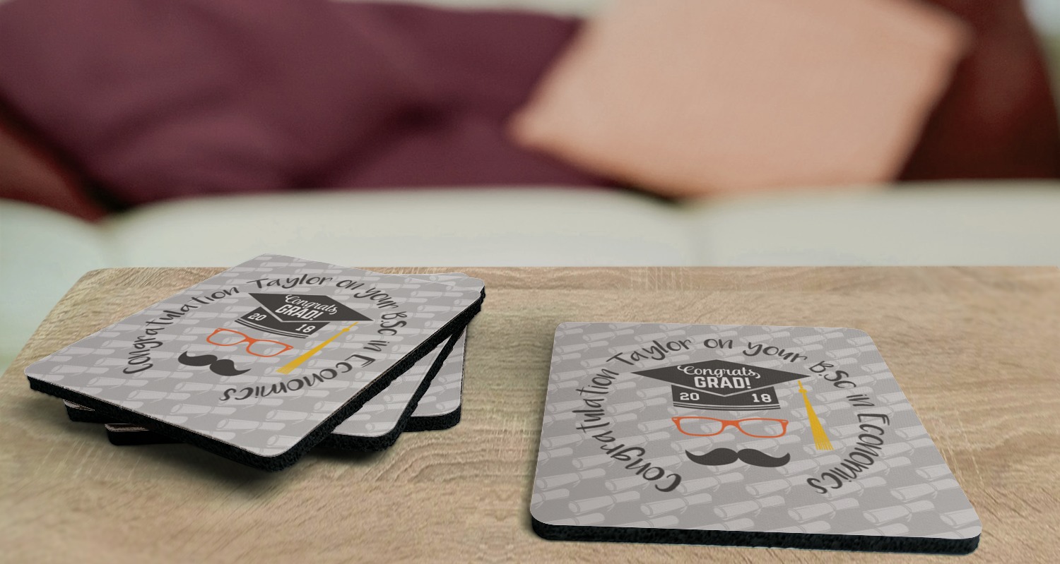 These drink coasters have a smooth, polyester top and a textured, rubber backing on its bottom. The non-slip rubber backing underneath works to keep any spills at bay. At 4 by 4 by 0.25 inches thick, these custom coasters are a suitable size for most drinkware. Your personalization is displayed atop the face of the cup coaster. We sell these rubber coasters in two different shapes: square and round. You can buy each shape as singulars or as a set of 4.