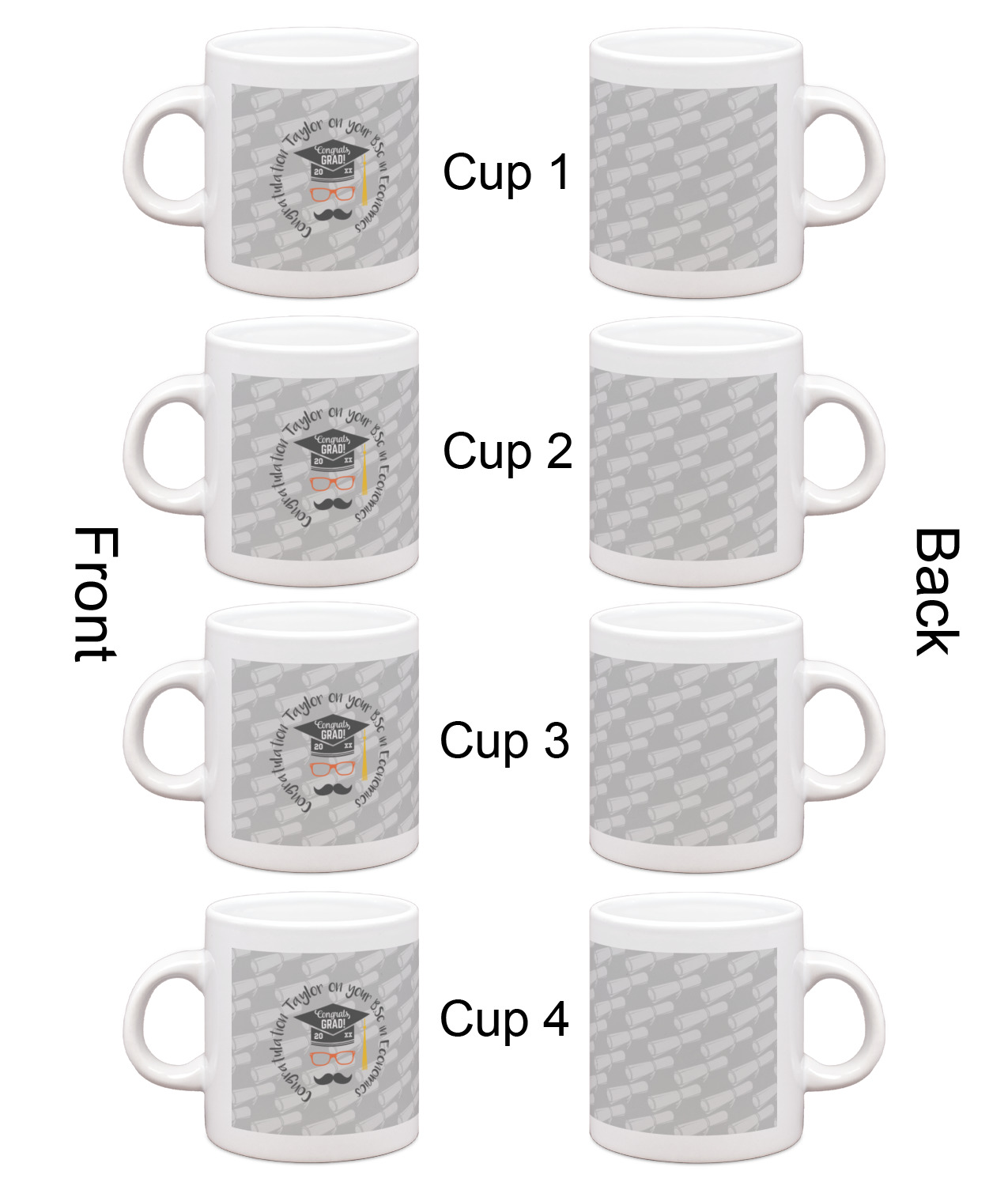 Each of our espresso mugs is a ceramic material sure to keep your drink warm. Personalize one cup for yourself, or order a set of 4! Its the perfect little gift for any coffee lover! We carry two sizes for you to personalize - 3 oz. (approx. 3.25" x 2.325" x 2.625") or 6 oz. (approx. 4" x 2.9" x 2.9"). Our 3 oz. mug is perfect for that single shot espresso while our 6 oz. mug can be your next favorite cappuccino cup holding two shots of espresso!