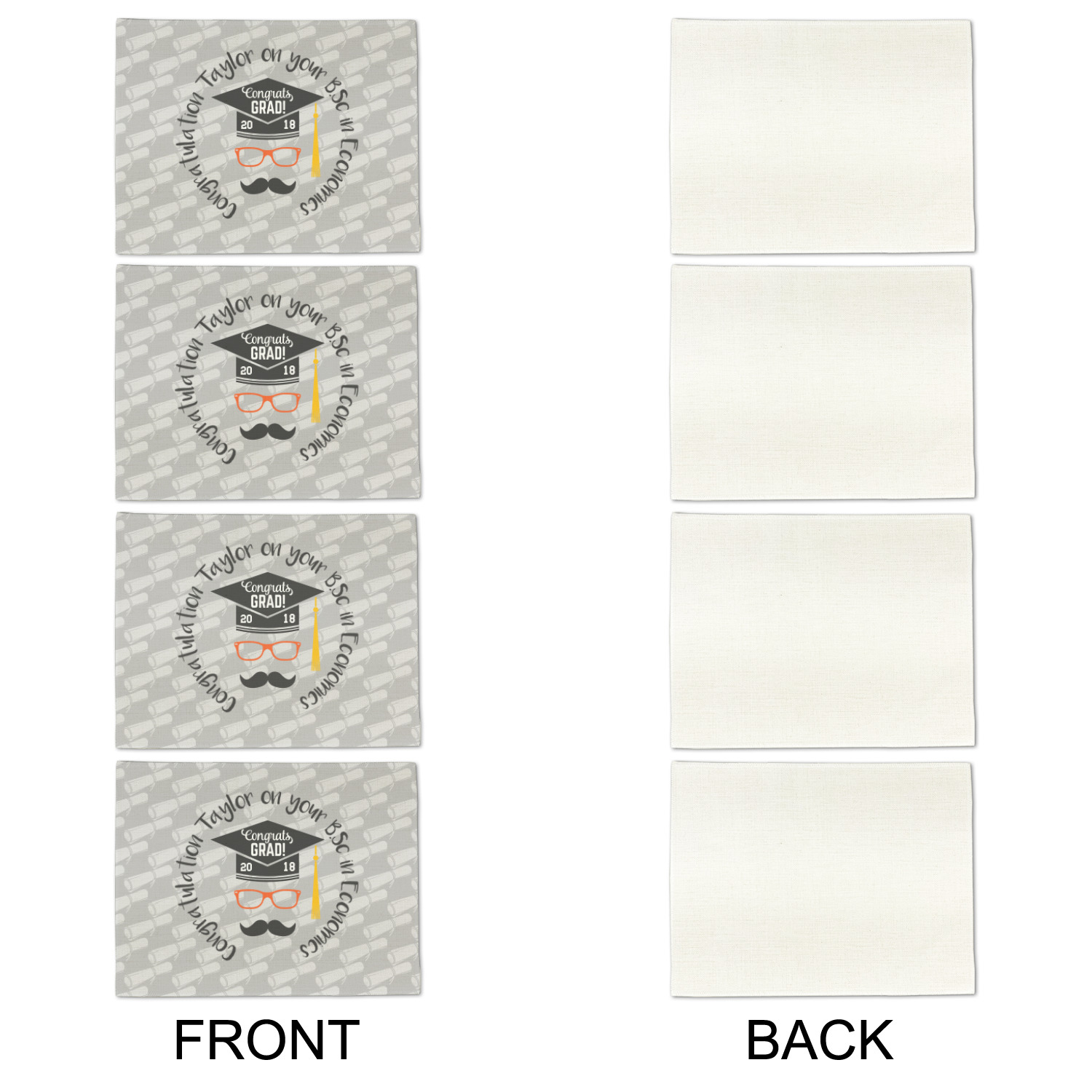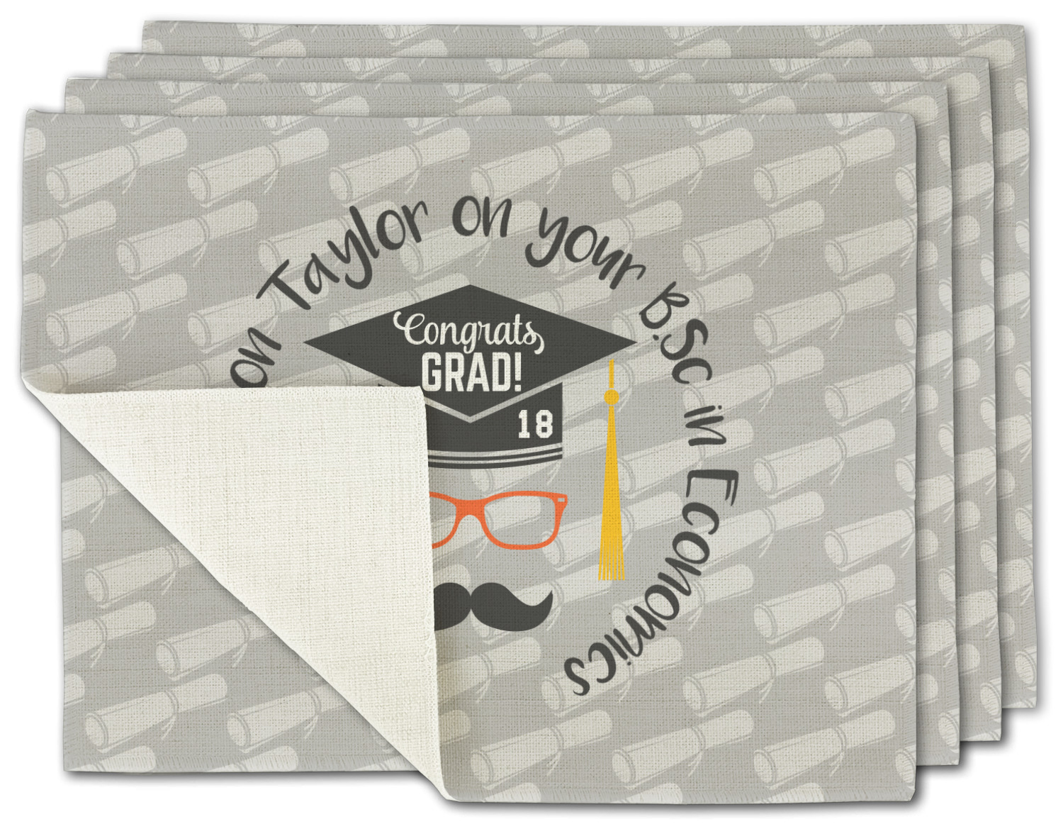 This whimsical and fun design makes the perfect graduation gift. We chose a tone on tone background with graduation scrolls and chose a light grey color. We chose graphic with circular text for our personalization style; change the text to suit your graduate. Customize the colors in the hipster graphic including the glasses, tassel and mustache color. We have other graduate backgrounds as well as graduate graphic in our system. So go ahead and change things to suit your graduate.