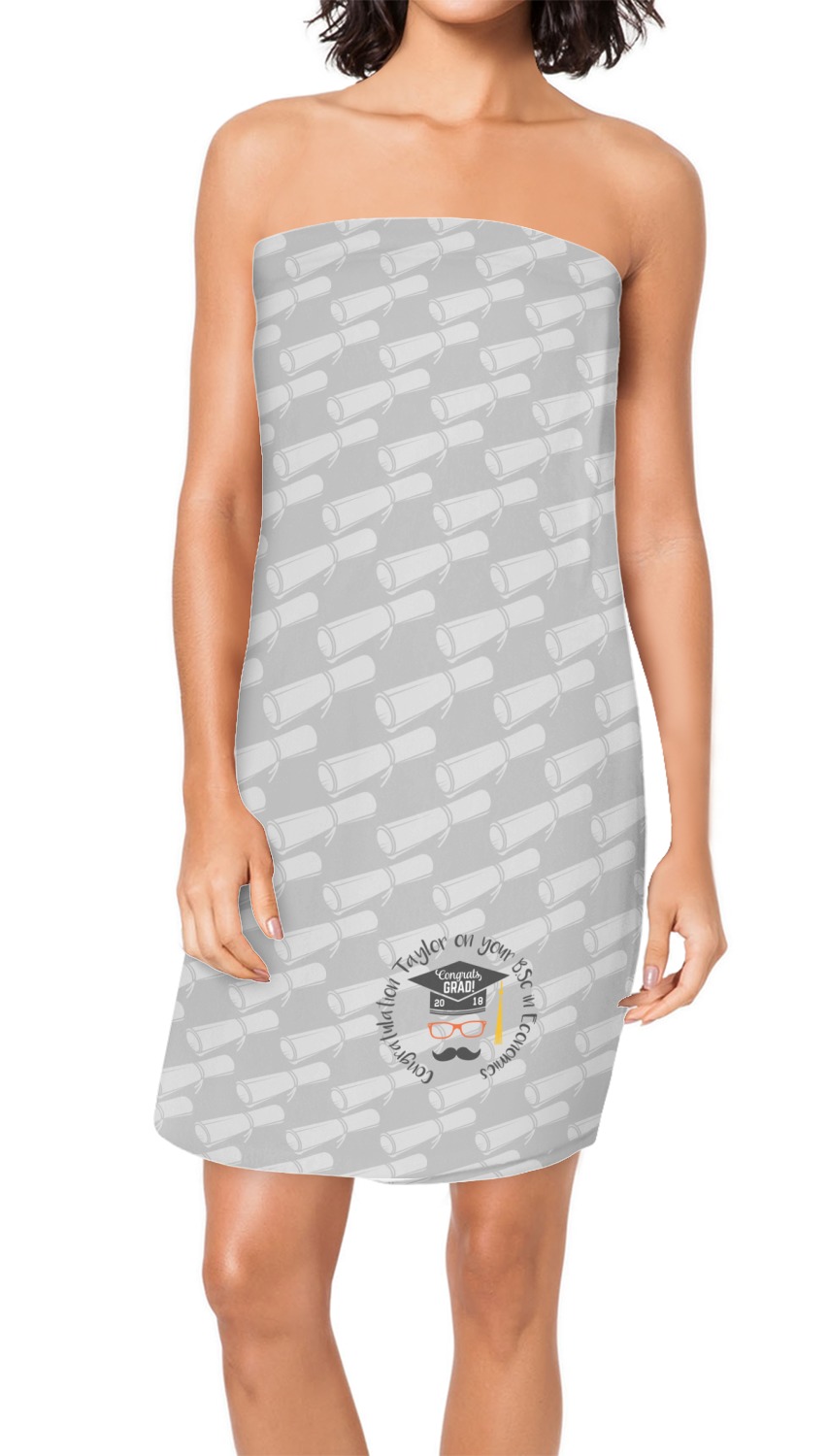 Made from a plush, fleece fabric, these luxurious towel wraps are comfortable and absorbent. They are printed, cut, and sewn for you, right here in the USA, after you place your order. These personalized bath wraps measure at approximately 59 by 32 inches, and display your customization across the outside.