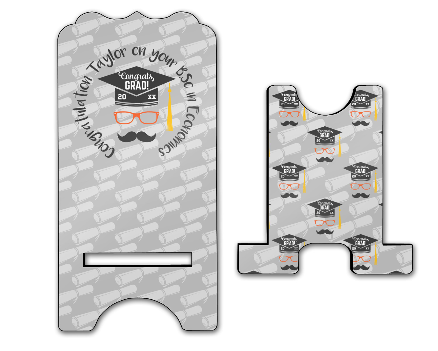 This whimsical and fun design makes the perfect graduation gift. We chose a tone on tone background with graduation scrolls and chose a light grey color. We chose graphic with circular text for our personalization style; change the text to suit your graduate. Customize the colors in the hipster graphic including the glasses, tassel and mustache color. We have other graduate backgrounds as well as graduate graphic in our system. So go ahead and change things to suit your graduate.