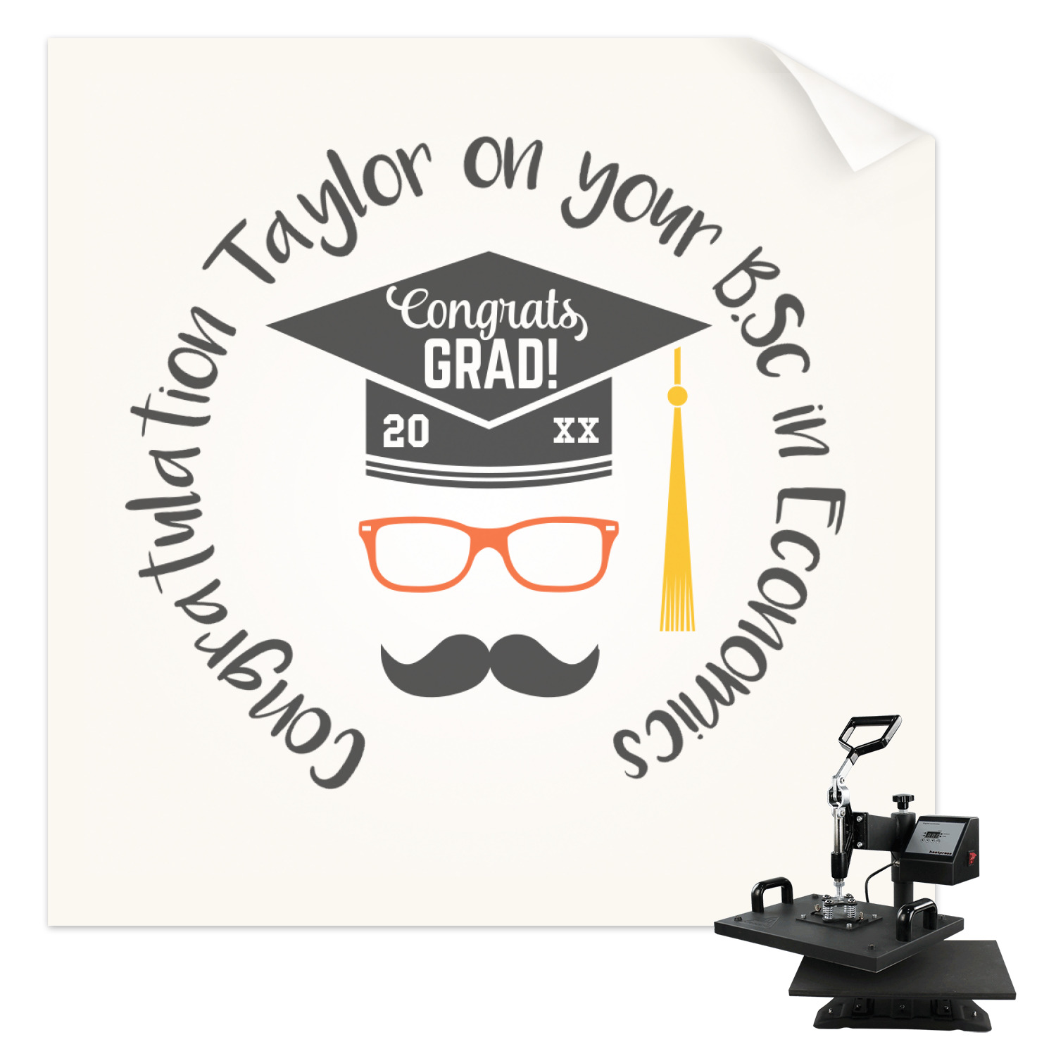 This whimsical and fun design makes the perfect graduation gift. We chose a tone on tone background with graduation scrolls and chose a light grey color. We chose graphic with circular text for our personalization style; change the text to suit your graduate. Customize the colors in the hipster graphic including the glasses, tassel and mustache color. We have other graduate backgrounds as well as graduate graphic in our system. So go ahead and change things to suit your graduate.
