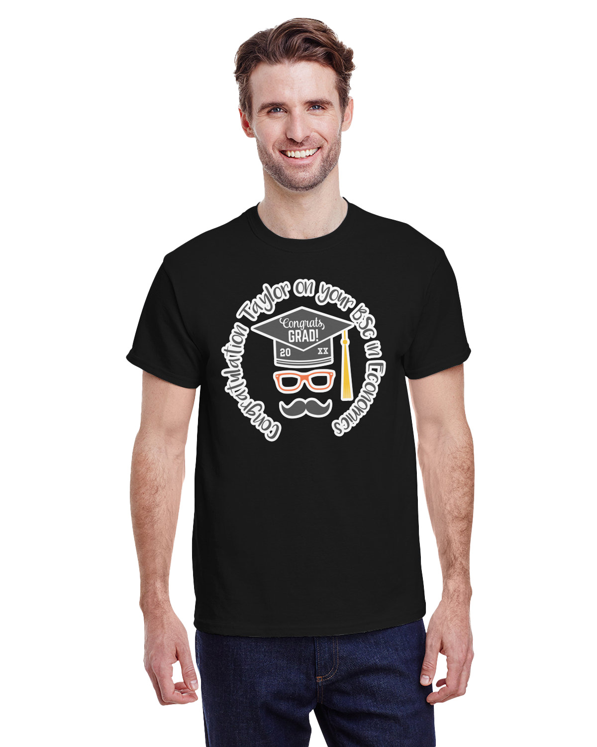 This whimsical and fun design makes the perfect graduation gift. We chose a tone on tone background with graduation scrolls and chose a light grey color. We chose graphic with circular text for our personalization style; change the text to suit your graduate. Customize the colors in the hipster graphic including the glasses, tassel and mustache color. We have other graduate backgrounds as well as graduate graphic in our system. So go ahead and change things to suit your graduate.