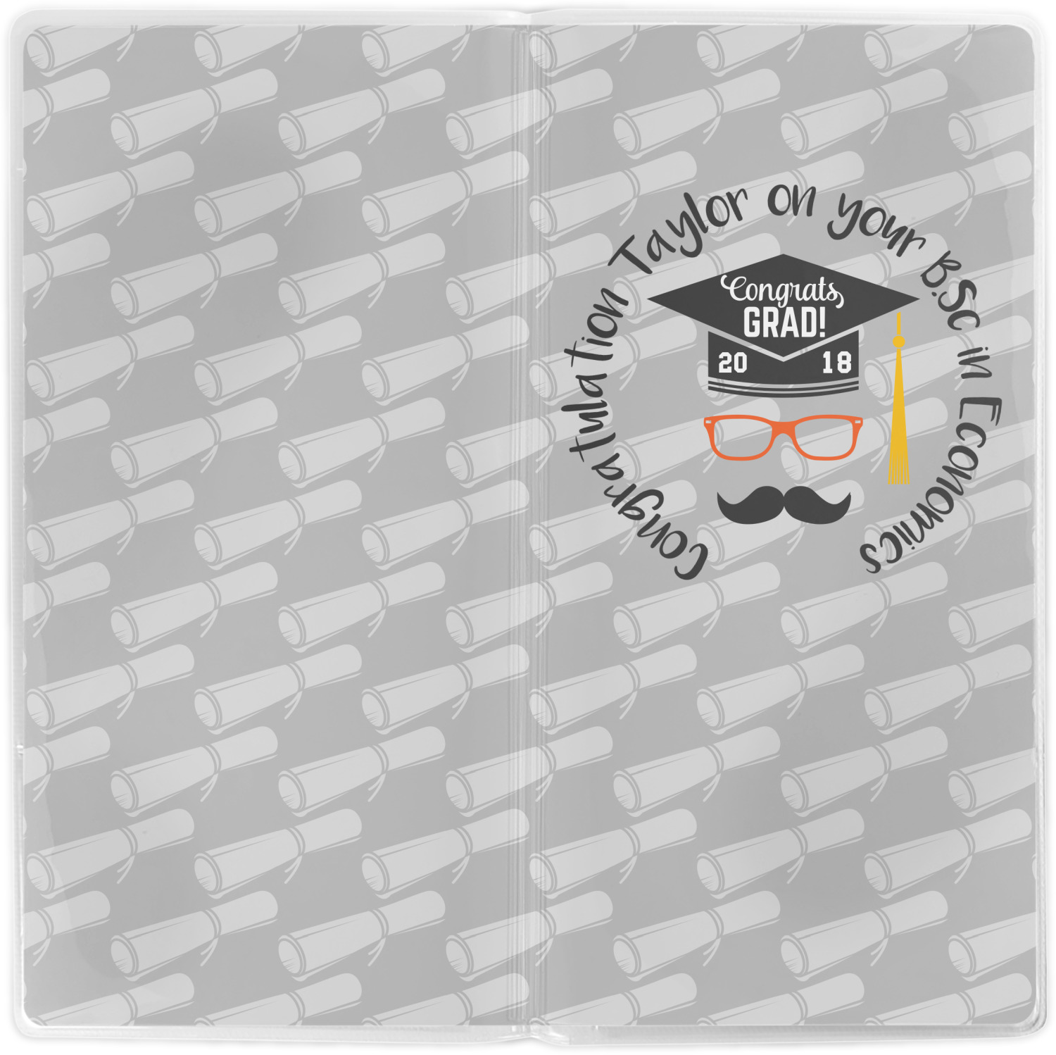 This whimsical and fun design makes the perfect graduation gift. We chose a tone on tone background with graduation scrolls and chose a light grey color. We chose graphic with circular text for our personalization style; change the text to suit your graduate. Customize the colors in the hipster graphic including the glasses, tassel and mustache color. We have other graduate backgrounds as well as graduate graphic in our system. So go ahead and change things to suit your graduate.