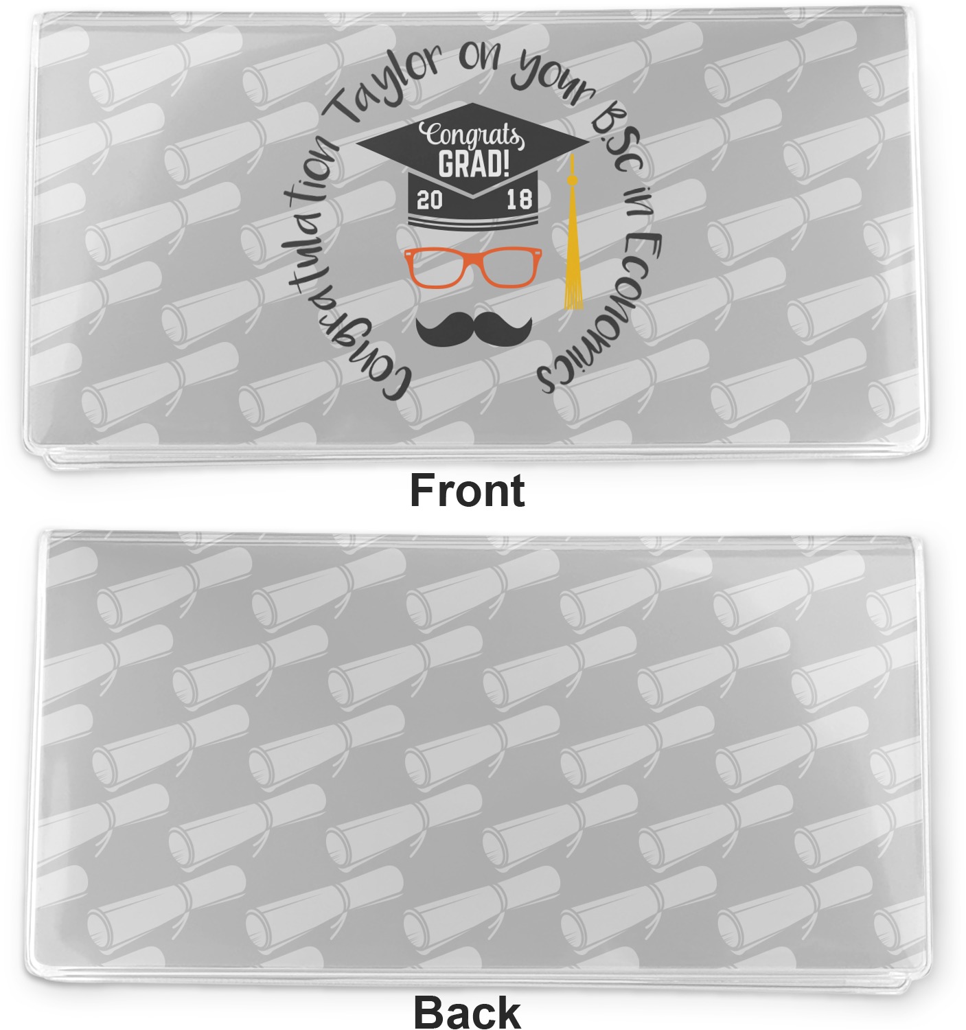 This whimsical and fun design makes the perfect graduation gift. We chose a tone on tone background with graduation scrolls and chose a light grey color. We chose graphic with circular text for our personalization style; change the text to suit your graduate. Customize the colors in the hipster graphic including the glasses, tassel and mustache color. We have other graduate backgrounds as well as graduate graphic in our system. So go ahead and change things to suit your graduate.